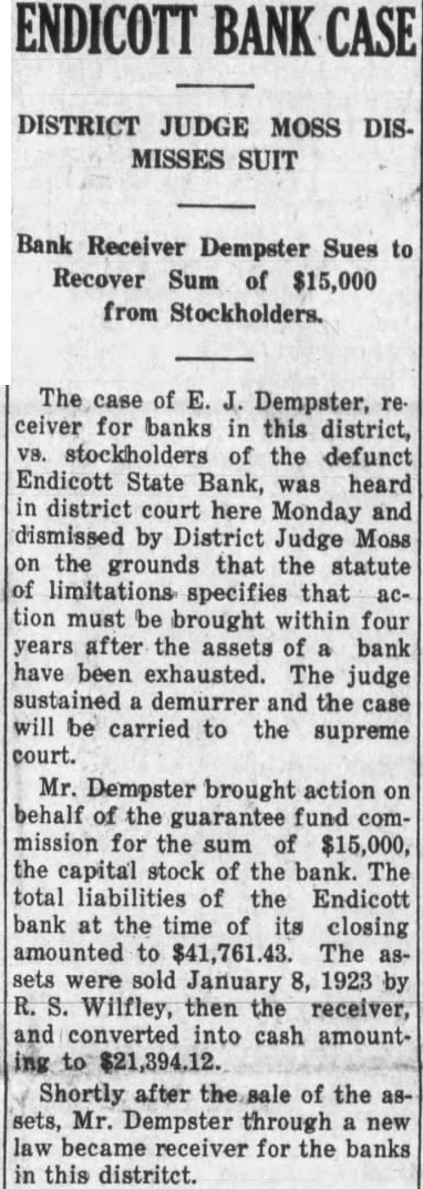 ENDICOTT DISTRICT JUDGE MOSS DISMISSES SUIT Bank Receiver Dempster Sues to Recover Sum of $15,000 from Stockholders. The case of E. J. Dempster, ceiver for banks in this district, V8. stockholders of the defunct Endicott State Bank, was heard in district court here Monday and dismissed by District Judge Moss on the grounds that the statute of limitations specifies that action must be brought within four years after the assets of a bank have been exhausted. The judge sustained demurrer and the case will be carried to the supreme court. Mr. Dempster brought action on behalf of the guarantee fund commission for the sum of $15,000, the capital stock of the bank. The total liabilities of the Endicott bank at the time of its closing amounted to $41,761.43. The assets were sold January 8, 1923 by R. S. Wilfley, then the receiver, and converted into cash amounting to $21,394.12. Shortly after of the assets, Mr. Dempster through a new law became receiver for the banks in this distritct.