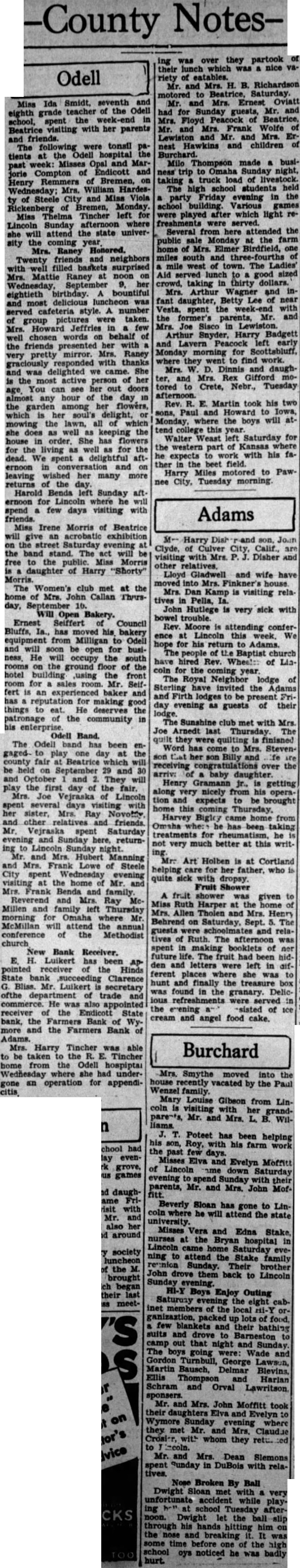 -County Notes- Odell Smidt, seventh and Miss Ida teacher of the Odell eighth grade spent the visiting with her parents Beatrice friends. The following were tonsil tients at the Odell Misses Opal and Marweek: of Endicott and jorie Compton Remmers of Henry Mrs. William Hardesof Steele City and Miss Viola Rickenberg of Bremen, Miss Thelma Tincher left for Lincoln Sunday afternoon where will attend the state university the coming year. Mrs. Raney Honored. Twenty friends and neighbors with filled baskets surprised Mrs. Mattie Raney at noon September her Wednesday, birthday. bountiful eightieth and most delicious served cafeteria style. number of taken. group Howard Jeffries few well chosen words behalf of the friends presented her with pretty mirror. Mrs. Raney very responded with thanks graciously and was delighted came. She the most active person of her You can see doors almost any hour of the day in the garden among her flowers, which is her soul's delight, or mowing the lawn. all which she does as well keeping the house order. She has flowers for the living well as for the dead. We spent delightful afternoon conversation and on leaving wished her many more returns the day. Harold Benda left Sunday aft. ernoon for Lincoln where will spend few days visiting with friends. Miss Irene Morris of Beatrice will give an acrobatic exhibition on the street Saturday evening the band stand. The act will to the public. Miss Morris daughter of Harry "Shorty" Morris. The Women's club met at the home of Mrs. John Callan Thursday, September 10. Will Open Bakery. Ernest Seiffert Council Bluffs, Ia., has moved his bakery equipment from Milligan to Odell and will soon be open for business. He will occupy the south rooms on the ground floor of the hotel building ,using the front room for sales room. Mr. Selffert an experienced baker and has reputation for making good things to eat. He deserves the patronage of the community his enterprise. Odell Band. The Odell band has been play one day the county fair Beatrice which will be held September 29 and and October and They will play the first day of the fair. Mrs. Joe Vejraska of Lincoln spent several days visiting with her sister, Mrs. Ray Novotity. and other relatives and friends. Mr. Vejraska spent Saturday evening and Sunday here, returnLincoln Sunday night. and Mrs. Hubert Manning and Mrs. Frank Lowe of Steele City spent Wednesday evening visiting the home Mr. Mrs. Frank Benda and family. Reverend and Mrs. Ray McMillen family left Thursday morning Omaha where Mr. McMillan will attend the annual conference of the Methodist church New Bank Receiver. E. H. Luikert has been pointed receiver of the Hinds State bank succeeding Clarence Bliss. Mr. Luikert secretary ofthe department of trade commerce. He was also appointed receiver the Endicott State bank, the Bank of Wymore the Farmers Bank Adams. Mrs. Harry Tincher was able be taken the Tincher home from the Odell hospiptal Wednesday where had undergone an operation for appendi- was over they partook their which was nice riety of eatables. Mrs. H. B. Richardson Mr. Saturday. Mrs. Ernest Oviatt Mr. guests, Mr. and had for Sunday Beatrice, Mrs. Floyd Mr. and Mrs. Frank Wolfe Lewiston and Mr. and Mrs. Ernest Hawkins and children Milo Thompson made business trip to Omaha night, taking truck load of school students held The high Friday evening in the party building Various games were played after which light rewere served. Several from here attended the public sale Monday at the farm home Mrs. Elmer Birdfield, one miles south and west of town. The Ladies' Aid served lunch good sized crowd, taking in thirty dollars. Mrs. Arthur Wagner and infant daughter, Betty Lee of near Vesta. spent the with the former's parents, Mr. and Mrs. Joe Sisco in Arthur Snyder, Harry Badgett and Lavern Peacock left early Monday for where went to find work. Mrs. D. Dinnis and daughter, and Mrs. Rex Gifford motored Crete, Nebr., Tuesday afternoon. Rev. E. Martin took his two sons, Paul and to Iowa, Monday, where the boys will tend college this year. Walter left Saturday for the western part of Kansas where he expects work with his father in the beet field. Harry Miles motored to Pawnee City, Tuesday morning. Adams son, Joan Clyde, of Culver City, Calif., are visiting with Mrs. Disher and other relatives. Lloyd Gladwell and wife have moved into Mrs. house. Mrs. Dan Kamp is visiting relatives in Ia. John Hutlege is very sick with bowel trouble. Rev. Moore is attending conference at Lincoln this week. We hope for his return to Adams. people of the Baptist church have hired Rev. Wheel:: of Liacoin for the coming year. The Royal Neighbor lodge of Sterling have invited the Adams and Firth lodges to be Friday evening as guests of their lodge. The Sunshine club met with Mrs. Joe Arnedt last The they is finished Word has come to Mrs. Stevenson her son Billy and receiving over the arriv: baby Henry Gramann getting along very nicely from his operation expects to be brought home this coming Harvey Bigley came home from Omaha he has been taking treatments for he not very much better at this writ- Mr. Art Holben is at Cortland helping for her father, who quite sick with dropsy. Fruit Shower fruit shower was given Miss Ruth Harper the home Mrs. Allen Tholen and Mrs. Henry Behrend on Saturday, Sept. The guests and relatives of Ruth. The afternoon spent in booklets of future The fruit had hidden and letters were left in different places where she was hunt and finally the box was found in the granary. Delicious refreshments were served the evening of cream and angel food cake. Burchard Mrs. Smythe moved into the house recently vacated by the Paul Wenzel family. Mary Louise Gibson from Lincoln visiting with her Mr. and Mrs. L. Williams Poteet has been helping his son, Roy, with his farm work the past few days. Misses Elva and Evelyn Moffitt of Lincoln down Saturday evening spend Sunday with fitt. parents, Mr. and Mrs. John MofBeverly Sloan has gone to Lincoln wher