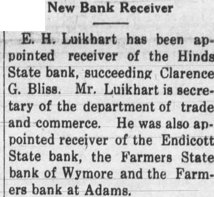 New Bank Receiver E. H. Luikhart has been appointed receiver of the Hinds State bank, succeeding Clarence G. Bliss. Mr. Luikhart is secretary of the department of trade and commerce. He was also appointed receiver of the Endicott State bank, the Farmers State bank of Wymore and the Farmers bank at Adams.