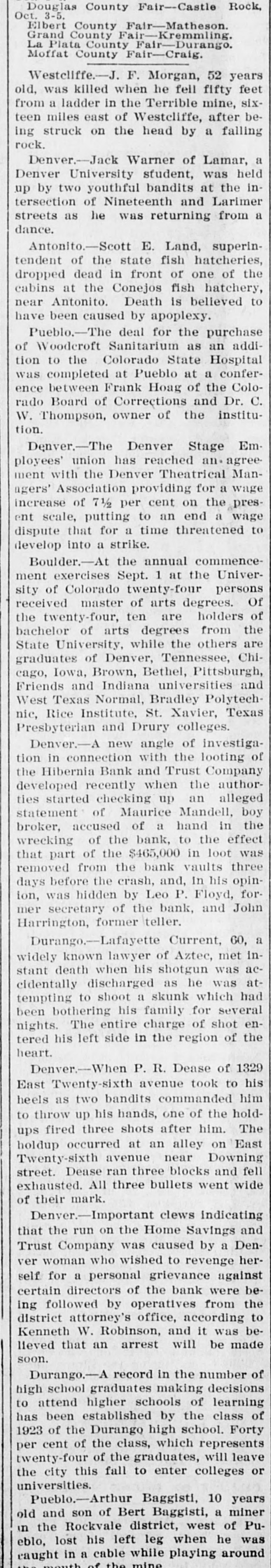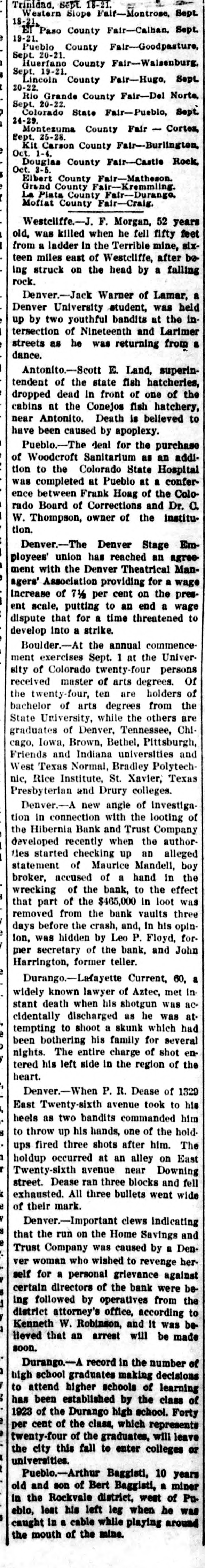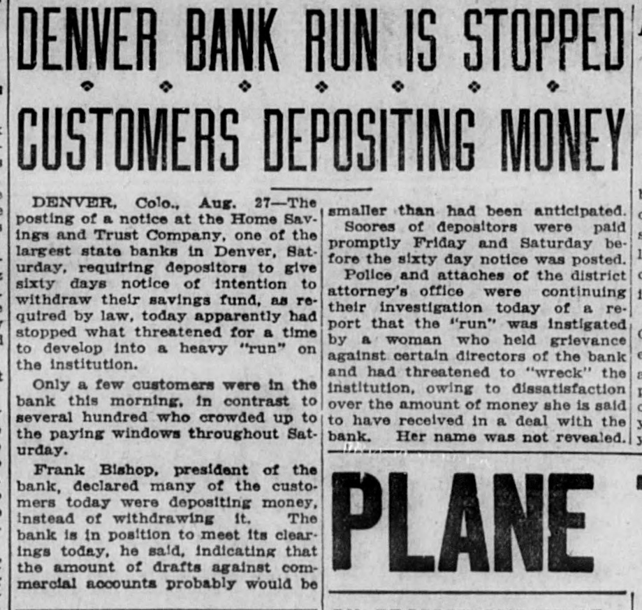 Denver. Bolstered by the backing of the Denver Clearing House Association and large deposits of a score or more of prominent business men, the Home Savings and Trust Company kept its doors wide open. This assurance was given by Frank L. Bishop and Michael A. McLaughlin, president and vice president, respectively, of the bank. They are of the opinion, as is most of the rest of the banking fraternity, that the hysteria and apprehension that attended the assignment of the Interstate Trust Company and the failure of the Hibernia Bank and Trust Company is passing rapidly. The peak of the excitement, based solely on the promiscuous spreading of unfounded rumors, was believed reached.