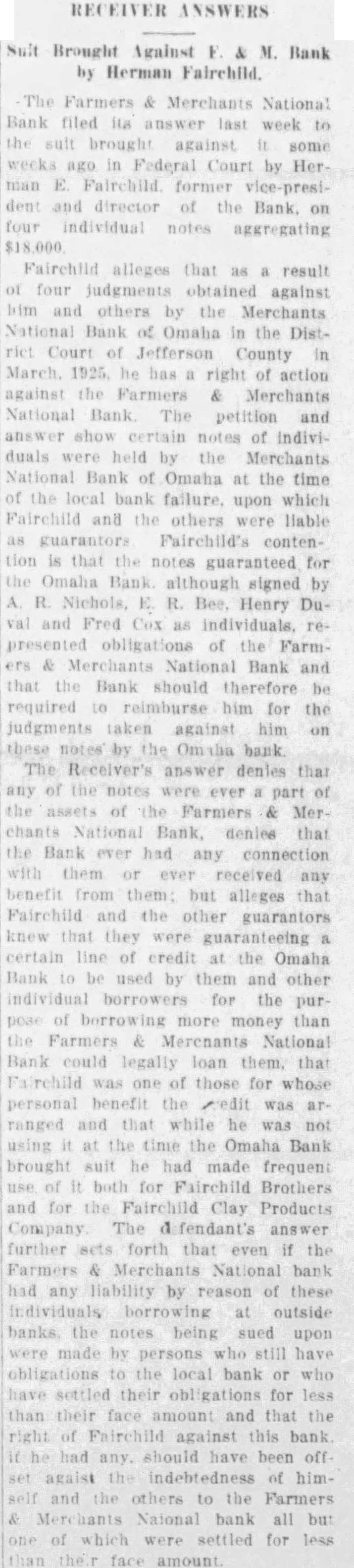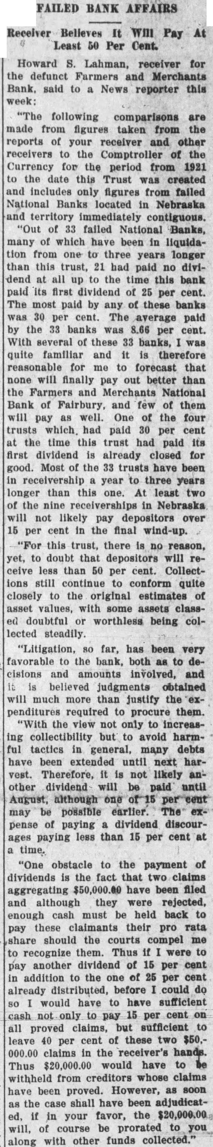 FAILED BANK AFFAIRS Receiver Believes It Will Pay At Least 50 Per Cent. Howard S. Lahman, receiver for the defunct Farmers and Merchants Bank, said to a News reporter this week: "The following comparisons are made from figures taken from the reports of your receiver and other receivers to the Comptroller of the Currency for the period from 1921 to the date this Trust was created and includes only figures from failed National Banks located in Nebraska and territory immediately contiguous. "Out of 33 failed National Banks, many of which have been in liquidation from one to three years longer than this trust, 21 had paid no dividend at all up to the time this bank paid its first dividend of 25 per cent. The most paid by any of these banks was 30 per cent. The average paid by the 33 banks was 8.66 per cent. With several of these 33 banks, was quite familiar and it is therefore reasonable for me to forecast that none will finally pay out better than the Farmers and Merchants National Bank of Fairbury, and few of them will pay as well. One of the four trusts which. had paid 30 per cent at the time this trust had paid its first dividend is already closed for good. Most of the 33 trusts have been in receivership year to three years longer than this one. At least two of the nine receiverships in Nebraska will not likely pay depositors over 15 per cent in the final wind-up. "For this trust, there is no reason, yet, to doubt that depositors will receive less than 50 per cent. Collections still continue to conform quite closely to the original estimates of asset values, with some assets classed doubtful or worthless being collected steadily. "Litigation, so far, has been very favorable to the bank, both as to decisions and amounts involved, and is believed judgments obtained will much more than justify the expenditures required to procure them. "With the view not only to increasing collectibility but to avoid harmful tactics in general, many debts have been extended until next harvest. Therefore, it is not likely another dividend will be paid until August, although one may be possible earlier. The pense of paying dividend discourages paying less than 15 per cent at time. "One obstacle to the payment of dividends is the fact that two claims aggregating $50,000.00 have been filed and although they were rejected, enough cash must be held back to pay these claimants their pro rata share should the courts compel me to recognize them. Thus if were to pay another dividend of 15 per cent in addition to the one of 25 per cent already distributed, before could do so would have to have sufficient cash not only to pay 15 per cent on all proved claims, but sufficient to leave 40 per cent of these two $50,claims in the receiver's hands. Thus $20,000.00 would have to withheld from creditors whose claims have been proved. However, as soon as the case shall have been adjudicated, if in your favor, the will, of course be prorated to you along with other funds collected."