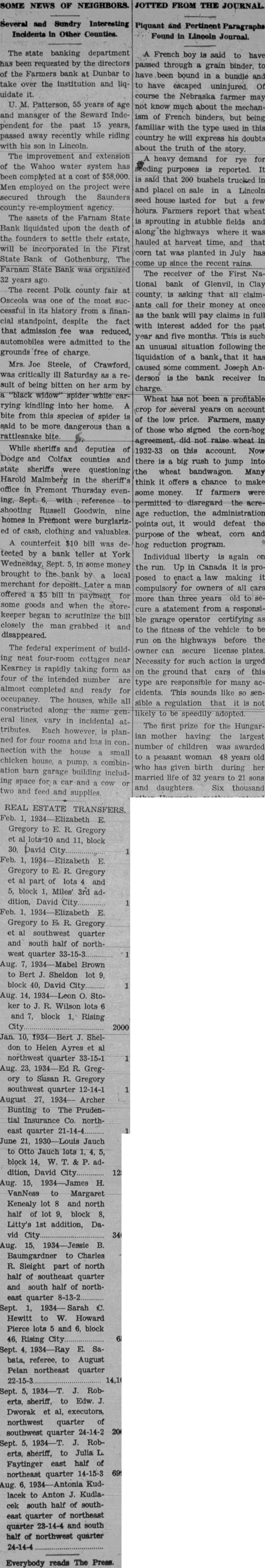 SOME NEWS OF NEIGHBORS. Several and Sundry Interesting Incidents in Other Counties. The state banking department French boy is said to have has been requested by the directors passed through grain binder, to of the Farmers bank at Dunbar to have been bound in bundle and take over the institution and liq- to have escaped uninjured. Of uidate it. course the Nebraska farmer may Patterson, 55 years of age not know much about the mechanand manager of the Seward Indeism of French binders, but being pendent for the past 15 years, familiar with the type used in this passed away recently while riding country he will his doubts express his son in Lincoln. about the truth of the story. The improvement and extension heavy demand for rye for of the Wahoo water system has purposes is reported. been completed at cost of $58,000. said that 200 bushels trucked in Men employed on the project were and placel on sale in Lincoln secured through the Saunders seed house lasted for but few county re-employment agency hours. Farmers report that wheat The assets of the Farnam State is sprouting in stubble fields and Bank liquidated upon the death of along the highways where it was the founders to settle their estate, hauled at harvest time, and that will be incorporated in the First corn tat was planted in July has State Bank of Gothenburg, The come up since the recent rains Farnam State Bank was organized The receiver of the First Nayears tional bank of in Clay The recent Polk county fair at county, is asking that all claimOsceola was one of the most sucants call for their money at once cessful in its history from finanas the bank will pay claims in full cial standpoint, despite the fact with interest added for the past that admission fee was reduced, year and five months This is such automobiles were admitted to the an unusual situation following the grounds free of charge. liquidation of bank, that it has Mrs. Joe Steele, of Crawford, caused some comment. Joseph Ancritically ill Saturday derson the bank receiver in sult of being bitten on her arm by charge. "black widow" Wheat has not been profitable rying kindling into her home. A crop for several years on account bite from this species of spider is of the low price. Farmers, many said to be more dangerous than of those who signed the corn-hog rattlesnake agreement, did While sheriffs and deputies of 1932-33 on this account. Now Dodge and Colfax counties and there big rush to jump into state sheriffs were questioning wheat the bandwagon. Many Harold Malmberg in the sheriff's think it offers chance to make office in Fremont Thursday evensome money. If farmers were reference permitted to the shooting Russell nine age reduction, the administration homes in Fremont were burglarizpoints out, it would defeat the of cash, clothing and valuables of the wheat, corn and purpose counterfeit $10 bill was hog reduction program. tected by bank teller at York Individual liberty is again on Sept. in some money the run. Up in Canada it is probrought to by local posed to enact law making merchant for man compulsory for owners of all cars offered $5 bill in payment for more than three years some goods and when the storecure statement from responsikeeper began to scrutinize the bill ble garage operator certifying closely the man grabbed it and to the fitness of the vehicle to disappeared. before the The federal experiment of buildowner can secure license plates. ing neat four-room cottages near Necessity for such action is urged Kearney is rapidly taking form as on the ground that cars of this four of the intended number type are responsible for many acalmost completed and ready for cidents. This sounds like so senoccupancy. The houses, while all sible that regulation not constructed along the same likely to be speedily adopted eral lines, vary in incidental The first prize for the Hungartributes Each however, is planian mother having the largest ned for four rooms and has in con. number of children was awarded nection with the house small peasant woman 48 years old chicken house, pump, combinwho has given birth during her barn garage building includmarried life of years to 21 sons ing space for car and cow and daughters Six thousand and feed and supplies REAL ESTATE TRANSFERS. Feb. E. Gregory to R. Gregory et lots-10 and 11, block 30, David City Feb. Gregory to Gregory et part lots and 5, block Miles' 3rd addition, David City Feb. E. Gregory to R. Gregory et southwest quarter and south half of north- west quarter 33-15-3 Aug. Brown to Bert Sheldon lot block 40, David City. Aug 14, O. Stoker to R. Wilson lots and block Rising City 10, Sheldon to Helen Ayres et northwest quarter 33-15-1 Aug. 23, Gregory to Susan R. Gregory southwest quarter 12-14-1 August 27, 1934- Archer Bunting to The Prudential Insurance Co. northeast quarter 21-14-4 June 21, Jauch east quarter 8-13-2 Sept. Sarah C. Hewitt to W. Howard Pierce lots and 6, block 46, Rising City Sept. E. Sabata, referee, to August Pelan northeast quarter 22-15-3 2000 24-14-4 Everybody reads The