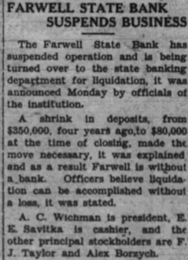 FARWELL STATE BANK SUSPENDS BUSINESS The Farwell State Bank suspended operation and being turned over to the state banking department for liquidation, it was announced Monday by officials of the institution. shrink in deposits, from four years ago,to the time of closing, made the move necessary, It was explained and result Farwell is without Officers believe tion can be accomplished without loss, stated. Wichman is president, Savitka is cashier, and the other principal stockholders are Taylor and Alex Borzych.
