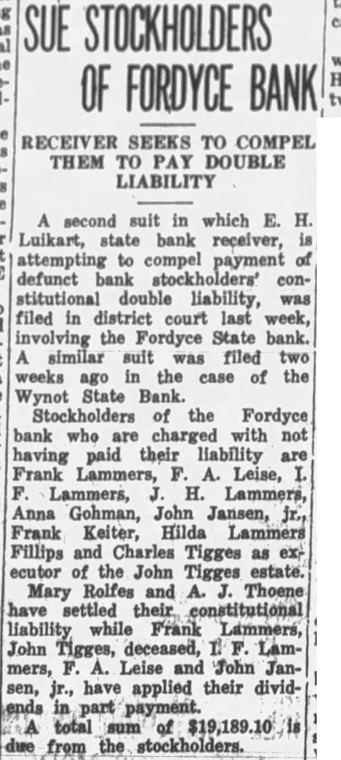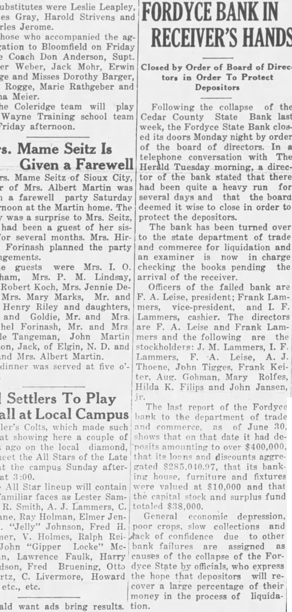 The failure this bank the which Hartington and county without facilities. years had strong banks. The Hartington National in 1928, Cedar County 1931 and the First National in the hands Other Cedar county banks have failed during the past Farmers State and the Fordyce State. The this city Organized in 1883 Organized 1883, was one the oldest and strongest banks northeast Nebraska and at deposits almost In June, 1920 peak year, deposits aggregated $950,000. When bank closed deposits had dwindled to In the First National and the Farmers State Bank. which located the present Hartington Building Loan building, merged occupied building on the corner Washington avenue and Fifth street. Officers the bank when closed its doors were Louis Goetz, president; Beste, vice-presiCarl cashier, and Lloyd Lynde Alphonse Lamassistant cashiers. Louis Goetz. Spork, John Hirschman, Carl Pedersen. Geo. Beste and Lloyd Lynde and the following owned stock the First National Bank: Amundson, Theo. Beste estate, Beste, Cameron, Dendinger, Dorsey, Mrs. Dan Felber, George, Louis Goetz, Aug Gohman, Mrs. Sarah Gordon, John Hochstein Mrs. Ethel Kerr estate, Krause, Lammers, K. Lammers, Lammers, McKenzie, Lloyd Lynde, Mrs. Ella Mason, Mrs. Hazel Olsen, Oswald, LuR. Parks, Pedersen, Peters, Ready, Mrs. Ready, Mrs. Robinson, Helen Scoville, Scoville, Spork, Agatha Uhing estate and Mildred W. Haggart. Lyon, bank examiner, arrived Friday make the inventory and now charge. Officers state that the percentof dividends which the institution will pay will depend on this year's and the prices which brings. Three former ficers of the First National and prominent its affairs for many Robinson, R. G. Mason and Weston.