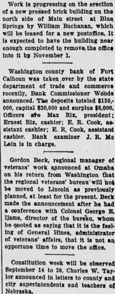Work progressing the erection pressed brick building the north side of Main street at Blue Springs by William Buchanan, which will be leased for postoffice. It expected to have the building near enough completed office into by November Washington county bank of Fort Calhoun was taken the state department of trade and commerce recently, Bank Commissioner Woods announced. deposits totaled $130,capital $30,000 and surplus $6,000. Officers Rix, president: Ernest Rix, cashier: Cook, sistant cashier; Cook, assistant cashier. Bank examiner Mc Lain charge. Gordon Beck, regional manager of work announced Omaha on from Washington that regional veterans' bureau not moved Lincoln previously planned, least for the present. Beck made the after he had conference Colonel George Ijams, director the bureau, whom he quoted saying that the feeling of General Hines, veterans' affairs, that opportune time move the office. Constitution week will be observed September 14 to Charles Taylor announced in letters county and city superintendents and teachers of Nebraska.