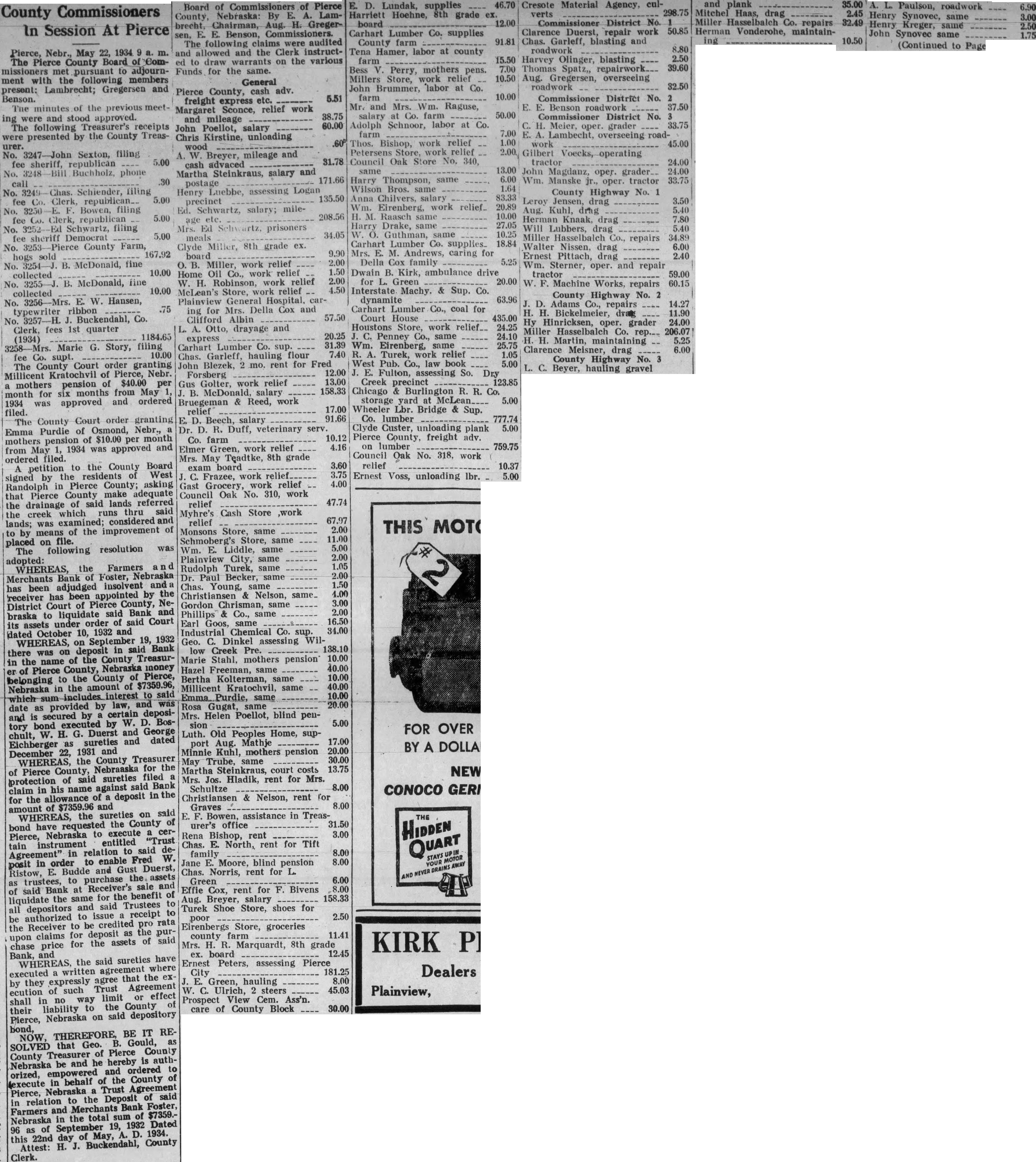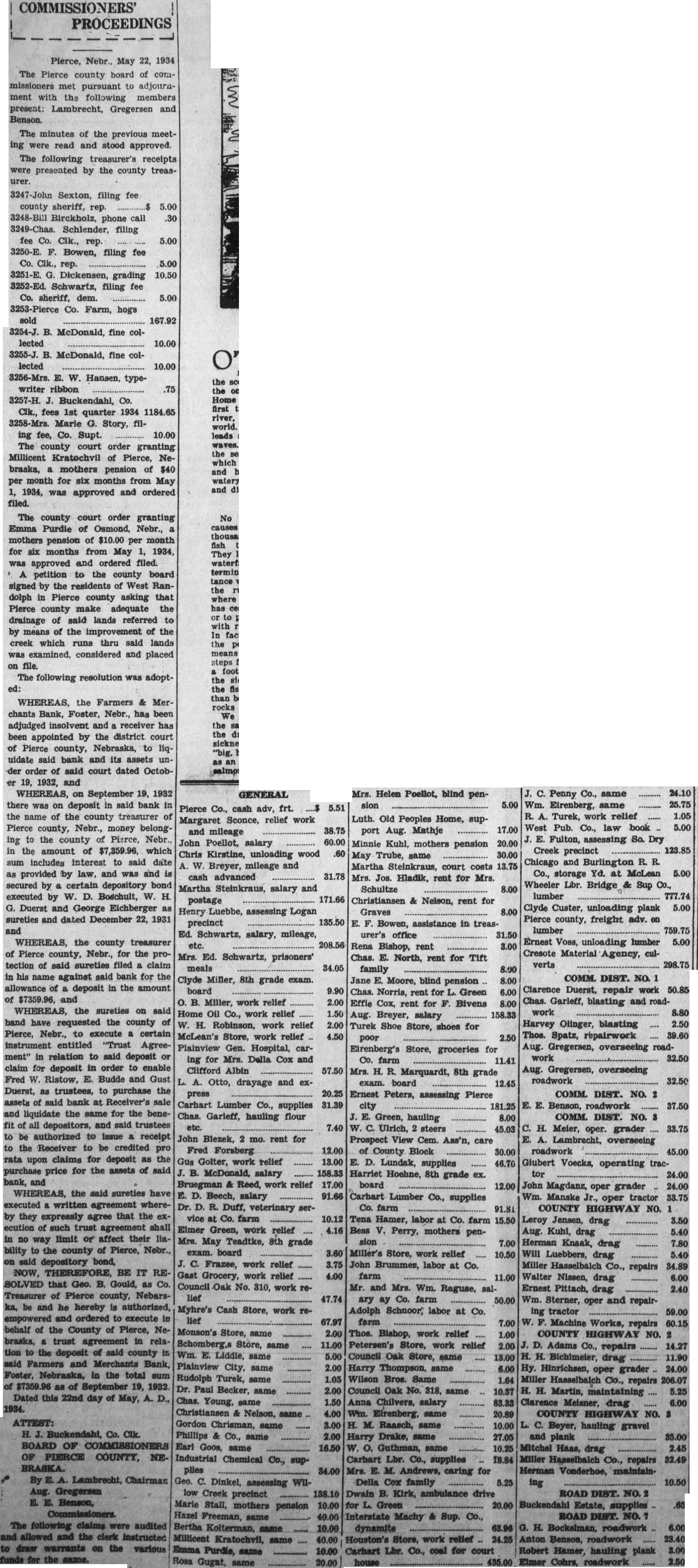 COMMISSIONERS' PROCEEDINGS Pierce, Nebr., May 22, 1934 The Pierce county board of commissioners met pursuant to adjourament with the following members present: Lambrecht, Gregersen and The minutes of the previous meeting were read and stood approved. The following treasurer's receipts were presented by the county treasurer. 3247-John Sexton, filing fee county sheriff, rep. $ 5.00 3248-Bill Birckholz, phone call .30 3249-Chas. Schlender, filing fee Co. Clk., rep. 5.00 3250-E. F. Bowen, filing fee Co. Clk., rep. 5.00 3251-E. G. Dickensen, grading 10.50 3252-Ed. Schwartz, filing fee Co. sheriff, dem. 5.00 3253-Pierce Co. Farm, hogs sold 167.92 10.00 3254-J. B. McDonald, fine collected 3255-J. B. McDonald, fine collected 10.00 3256-Mrs. E. W. Hansen, typewriter ribbon .75 3257-H. J. Buckendahl, Co. Clk., fees 1st quarter 1934 1184.65 3258-Mrs. Marie G. Story, filing fee, Co. Supt. 10.00 The county court order granting Millicent Kratochvil of Pierce, Nebraska, a mothers pension of $40 per month for six months from May 1, 1934, was approved and ordered filed. The county court order granting Emma Purdie of Osmond, Nebr., a mothers pension of $10.00 per month for six months from May 1, 1934, was approved and ordered filed. A petition to the county board signed by the residents of West Randolph in Pierce county asking that Pierce county make adequate the drainage of said lands referred to by means of the improvement of the creek which runs thru said lands was examined, considered and placed on file. The following resolution was adopted: WHEREAS, the Farmers & Merchants Bank, Foster, Nebr., has been adjudged insolvent and a receiver has been appointed by the district court of Pierce county, Nebraska, to liquidate said bank and its assets under order of said court dated October 19, 1932, and WHEREAS, on September 19, 1932 there was on deposit in said bank in the name of the county treasurer of Pierce county, Nebr., money belonging to the county of Pierce, Nebr., in the amount of $7,359.96, which sum includes interest to said date as provided by law, and was and is secured by a certain depository bond executed by W. D. Boschult, W. H. G. Duerst and George Eichberger as sureties and dated December 22, 1931 and WHEREAS, the county treasurer of Pierce county, Nebr., for the protection of said sureties filed a claim in his name against said bank for the allowance of a deposit in the amount of $7359.96, and WHEREAS, the sureties on said band have requested the county of Pierce, Nebr., to execute a certain instrument entitled "Trust Agreement" in relation to said deposit or claim for deposit in order to enable Fred W. Ristow, E. Budde and Gust Duerst, as trustees, to purchase the assets of said bank at Receiver's sale and liquidate the same for the benefit of all depositors, and said trustees to be authorized to issue a receipt to the Receiver to be credited pro rata upon claims for deposit as the purchase price for the assets of said bank, and WHEREAS, the said sureties have executed a written agreement whereby they expressly agree that the execution of such trust agreement shall in no way limit or affect their liability to the county of Pierce, Nebr., on said depository bond, NOW, THEREFORE, BE IT RESOLVED that Geo. B. Gould, as Co. Treasurer of Pierce county, Nebarska, be and he hereby is authorized, empowered and ordered to execute in behalf of the County of Pierce, Nebraska, a trust agreement in relation to the deposit of said county in said Farmers and Merchants Bank, Foster, Nebraska, in the total sum of $7359.96 as of September 19, 1932. Dated this 22nd day of May, A. D., 1934. ATTEST: H. J. Buckendahl, Co. Clk. BOARD OF COMMISSIONERS OF PIERCE COUNTY, NEBRASKA. By Lambrecht, Chairman Aug. Gregersen E. E. Benson, Commissioners. The following claims were audited and allowed and the clerk instructed to draw warrants on the various funds for the same. GENERAL Pierce Co., cash adv, frt. 5.51 Margaret Sconce, relief work and mileage 38.75 John Poellot, salary 60.00 Chris Kirstine, unloading wood .60 A. W. Breyer, mileage and cash advanced 31.78 Martha Steinkraus, salary and postage 171.66 Henry Luebbe, assessing Logan precinct 135.50 Ed. Schwartz, salary, mileage, etc. 208.56 Mrs. Ed. Schwartz, prisoners' meals 34.05 Clyde Miller, 8th grade exam. board 9.90 O. B. Miller, work relief 2.00 Home Oil Co., work relief 1.50 W. H. Robinson, work relief 2.00 McLean's Store, work relief 4.50 Plainview Gen. Hospital, caring for Mrs. Della Cox and Clifford Albin 57.50 L. A. Otto, drayage and express 20.25 Carhart Lumber Co., supplies 31.39 Chas. Garleff, hauling flour etc. 7.40 John Blezek, 2 mo. rent for Fred Forsberg 12.00 Gus Golter, work relief 13.00 J. B. McDonald, salary 158.33 Bruegman & Reed, work relief 17.00 E. D. Beech, salary 91.66 Dr. D. R. Duff, veterinary service at Co. farm 10.12 Elmer Green, work relief 4.16 Mrs. May Teadtke, 8th grade exam. board 3.60 J. C. Frazee, work relief 3.75 Gast Grocery, work relief 4.00 Council Oak No. 310, work relief 47.74 Myhre's Cash Store, work relief 67.97 Monson's Store, same 2.00 Schomberg,s Store, same 11.00 Wm. E. Liddle, same 5.00 Plainview City, same 2.00 Rudolph Turek, same 1.05 Dr. Paul Becker, same 2.00 Chas. Young, same 1.50 Christiansen & Nelson, same 4.00 Gordon Chrisman, same 3.00 Phillips & Co., same 2.00 Earl Goos, same 16.50 Industrial Chemical Co., supplies 34.00 Geo. C. Dinkel, assessing Willow Creek precinct 138.10 Marie Stall, mothers pension 10.00 Hazel Freeman, same 40.00 Bertha Kolterman, same 10.00 Millicent Kratochvil, same 40.00 Emma Purdie, same 10.00 Rosa Gugat, same 20.00 Mrs. Helen Poellot, blind pension 5.00 Luth. Old Peoples Home, support Aug. Mathje 17.00 Minnie Kuhl, mothers pension 20.00 May Trube, same 30.00 Martha Steinkraus, court costs 13.75 Mrs. Jos. Hladik, rent for Mrs. Schultze 8.00 Christiansen & Nelson, rent for Graves 8.00 E. F. Bowen, assistance in treasurer's office 31.50 Rena Bishop, rent 3.00 Chas. E. North, rent f