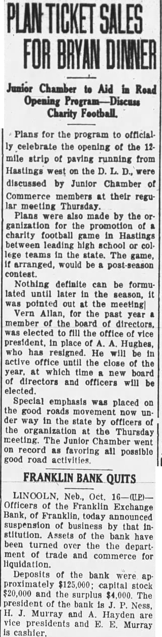 TICKET SALES FOR BRYAN Junior Chamber to Aid in Road Opening ProgramCharity Football. Plans for the program to official ly celebrate the opening of the 12mile strip of paving running from Hastings west on the D. L. D., were discussed by Junior Chamber of Commerce members at their regular meeting Thursday. Plans were also made by the organization for the promotion of charity football game in Hastings between leading high school or college teams in the state. The game, If arranged, would be a post-season contest. Nothing definite can be formulated until later in the season, it was pointed out at the meeting Vern Allan, for the past year member of the board of directors, was elected to fill the office of vice president, in place of A. A. Hughes, who has resigned. He will be in active office until the close of the year. at which time new board of directors and officers will be elected. Special emphasis was placed on the good roads movement now under way in the state by officers of the organization at the Thursday meeting. The Junior Chamber went on record as favoring all possible good road activities FRANKLIN BANK QUITS LINCOLN, Neb., Oct. 16-(U.P)Officers of the Franklin Exchange Bank, of Franklin, today announced suspension of business by that institution. Assets of the bank have been turned over the the department of trade and commerce for liquidation. Deposits of the bank were ap proximately $125,000; capital stock $20,000 and the surplus $4,000. The president of the bank is P. Ness, H. J. Murray and A. Hayden are vice presidents and E. E. Murray is cashier.