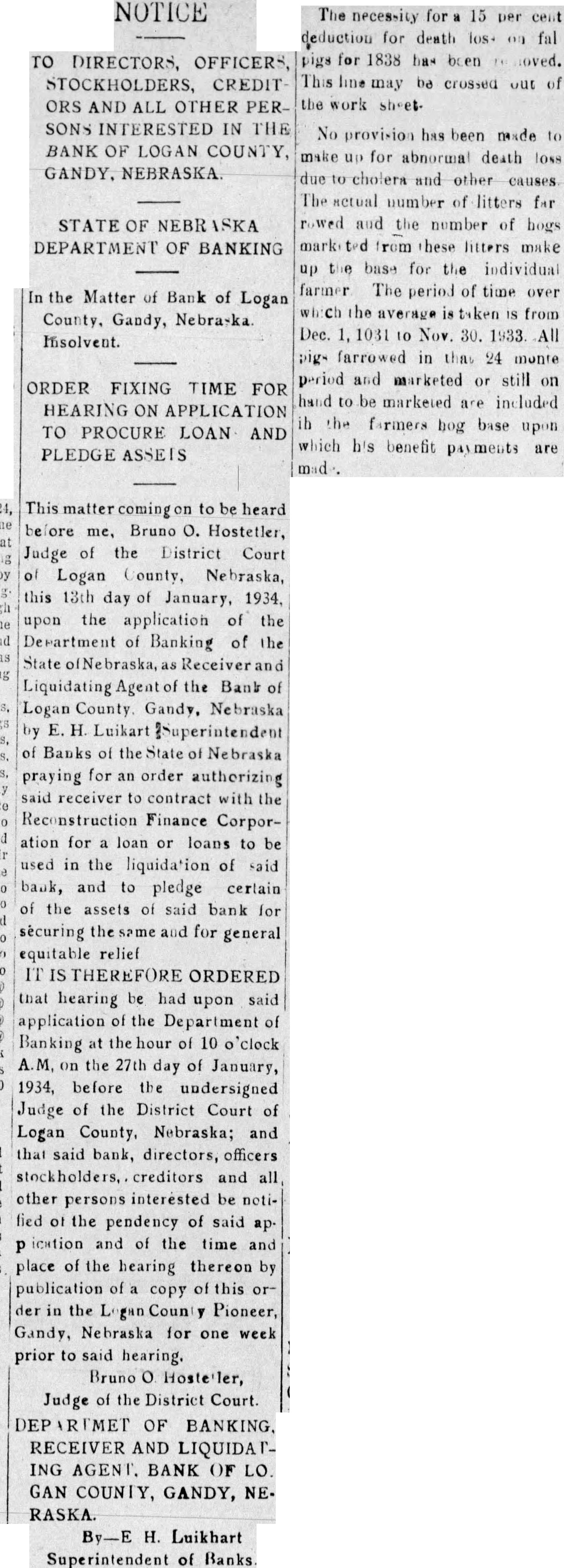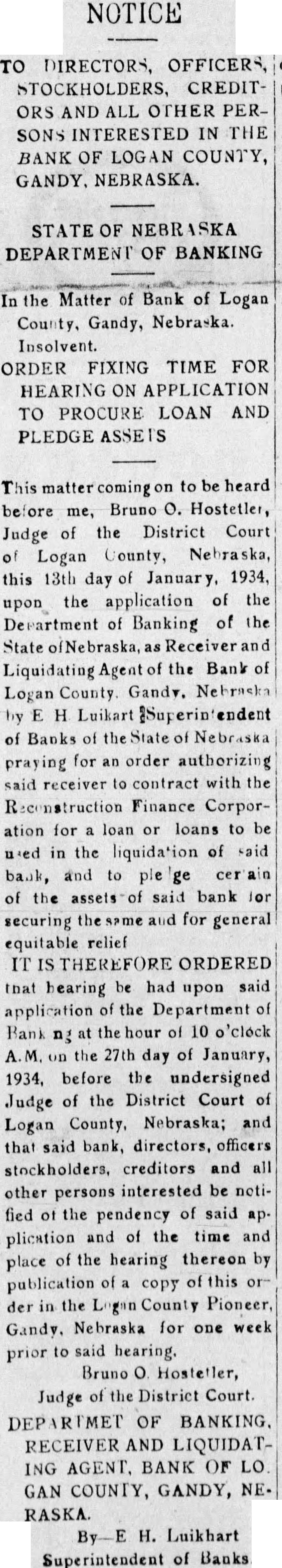 NOTICE TO DIRECTORS, OFFICERS, STOCKHOLDERS, CREDITORS AND ALL OTHER PERSONS INTERESTED IN THE BANK OF LOGAN COUNTY, GANDY, NEBRASKA. STATE OF NEBRASKA DEPARTMENT OF BANKING In the Matter of Bank of Logan County, Gandy, Nebraska. Insolvent. ORDER FIXING TIME FOR HEARING ON APPLICATION TO PROCURE LOAN AND PLEDGE ASSETS This matter coming to be heard before me, Bruno O. Hostetler, Judge of the District Court of Logan County, Nebraska, this 13th day of January, 1934, upon the application of the Department of Banking of the State ofNebraska, as Receiver and Liquidating Agent of the Bank of Logan County. Gandy. Nebraska by E H Luikart Superintendent of Banks of the State of Nebraska praying for an order authorizing said receiver to contract with the Reconstruction Finance Corporation for a loan or loans to be used in the liquidation of said bank, and to pleage certain of the assets of said bank for securing the same and for general equitable relief IT IS THEREFORE ORDERED that hearing be had upon said application of the Department of Bank ng at the hour of 10 o'clock A.M. on the 27th day of January, 1934, before the undersigned Judge of the District Court of Logan County, Nebraska; and that said bank, directors, officers stockholders, creditors and all other persons interested be notified of the pendency of said application and of the time and place of the hearing thereon by publication of a copy of this or der in the Logan County Pioneer, Gandy, Nebraska for one week prior to said hearing. Bruno o Hosteller, Judge of the District Court. DEPARTMET OF BANKING. RECEIVER AND LIQUIDATING AGENT. BANK OF LO. GAN COUNTY, GANDY, NE- RASKA. By-E H. Luikhart Superintendent of Banks.