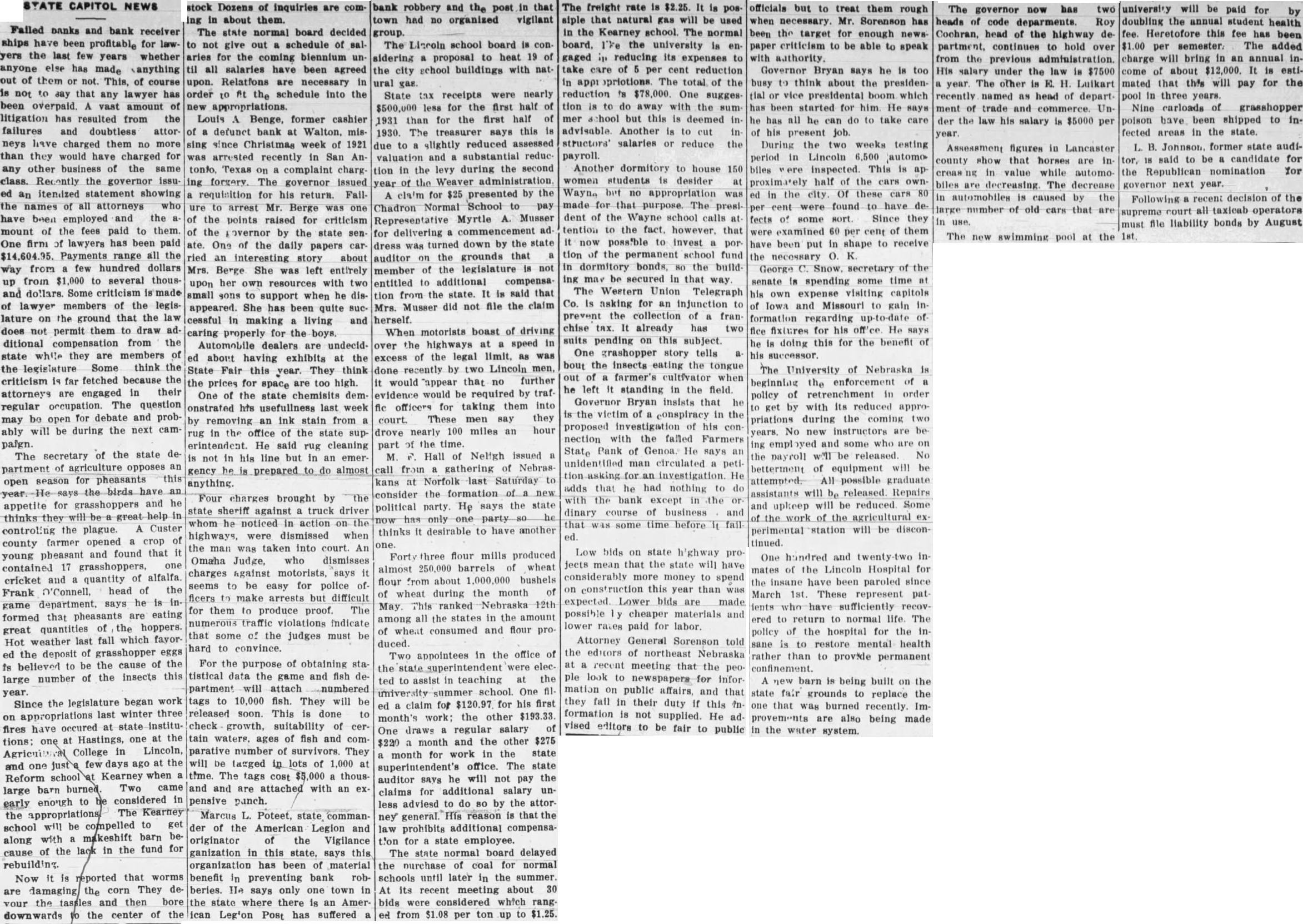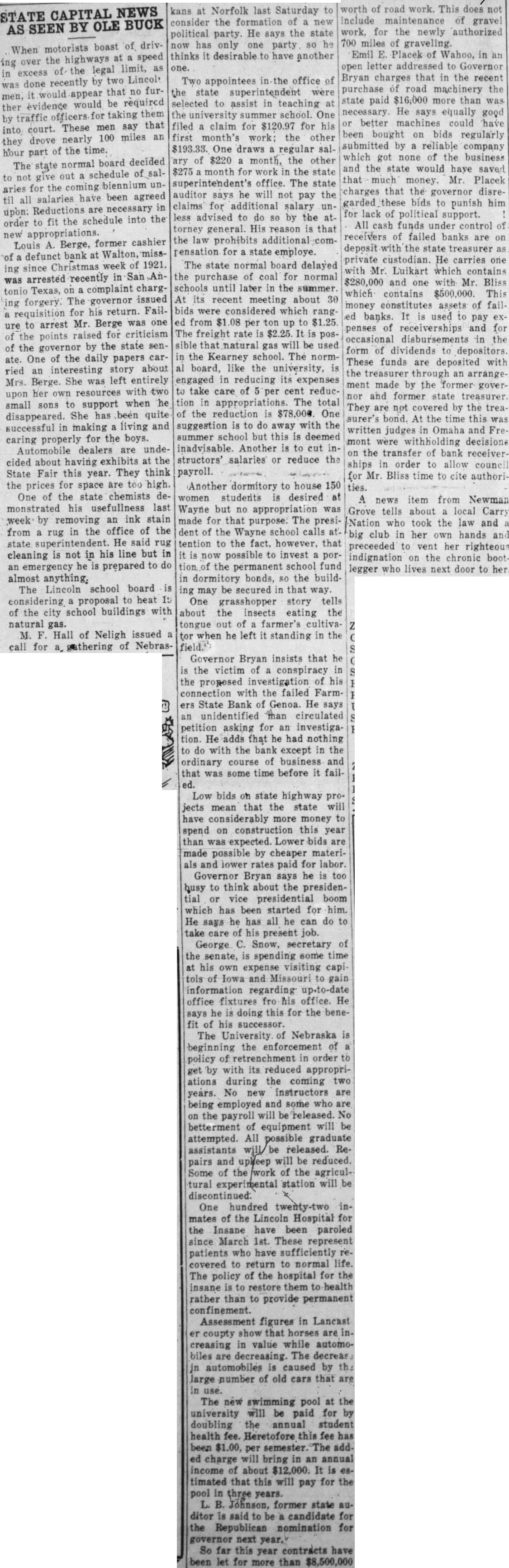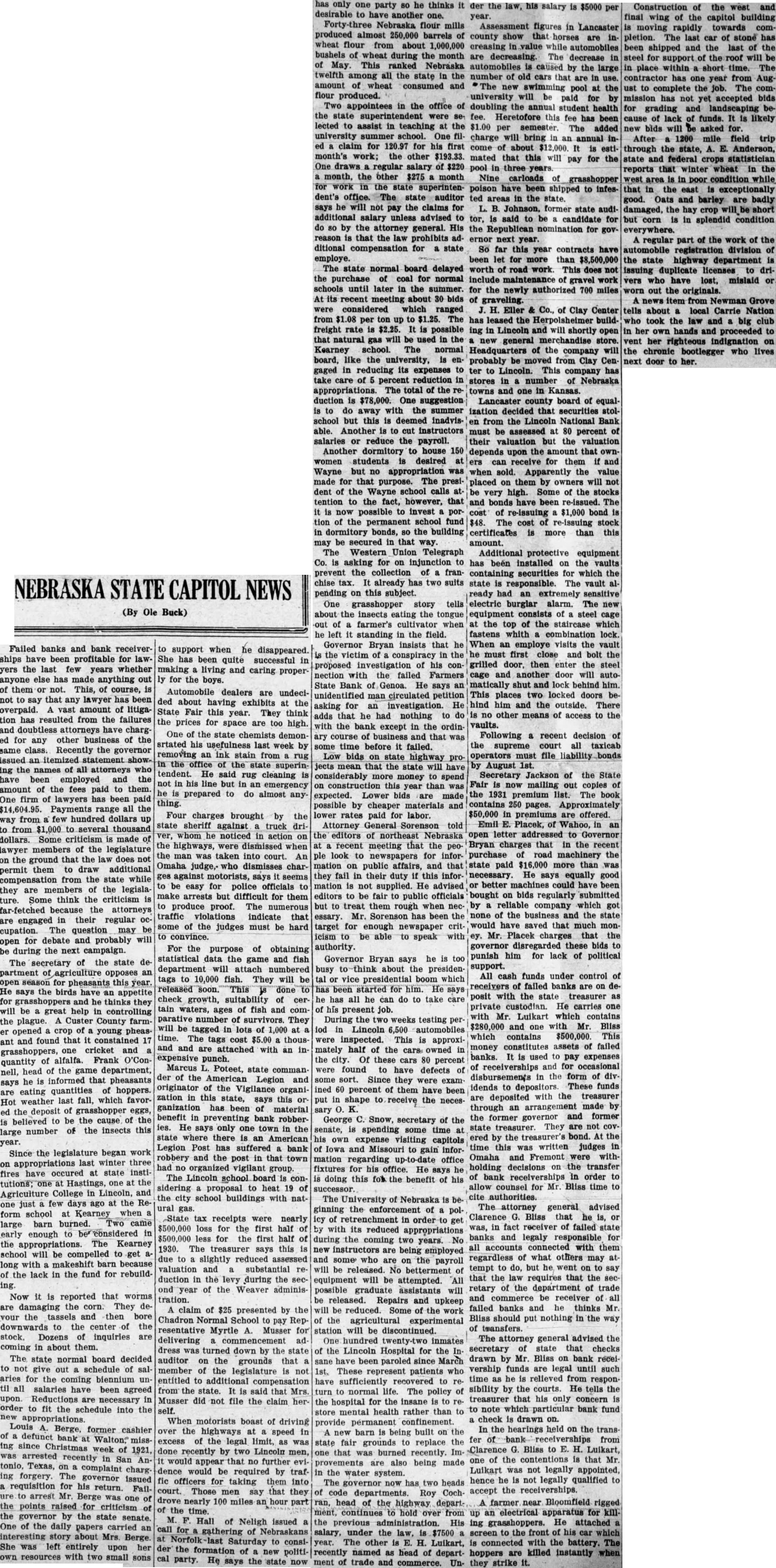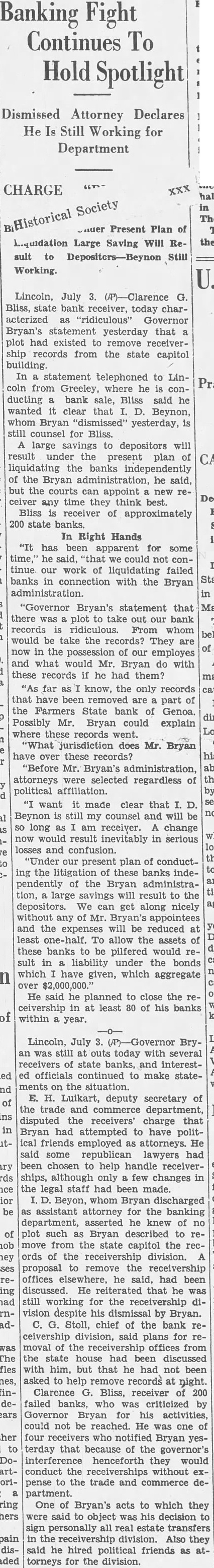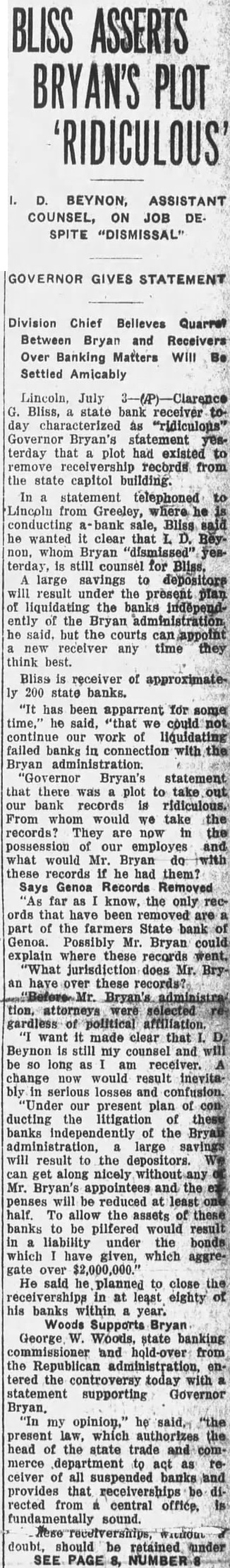 BLISS AVERS PLOT STORY RIDICULOUS Records Now in Possession of Receivers Who Plan to Work From State House. Clarence G. Bliss, former secretary of trade and in statement given out Friday Greeley, where he conducting sale said that he was surprised that Governor Bryan would charge plot existed to remove receivership records from the capitol and that he should presume discharge Bliss' counsel, D. Beynon. He says the story is ridiculous for the reason that the records are in the possession of the employes the Mr. Bryan would do with them he took them himself He added that far as he knows the only records that have been removed made up of part of the audit the Farmers State bank of Genoa, about which the senate ordered an investigation. Mr. Bliss says that the receivers as officers of the court have legal control these records and not the governor. The order naming each case recited "that Clarence G. Bliss, receiver is hereauthorized to take all the books, records and assets every kind and belonging said bank. He sug. gests that the governor look the law contempt that attaches to those who interfere with an order court. He added: "It has been apparent for some time that we could not continue our work of liquidating failed banks in connection with Mr. Bryan's administration. At meeting of all receivers this week to advise Mr. Bryan of our and at the same time we notified the heads our including Mr. Mr. Stall. There was no discussion of moving records and plans are that the work be in our quarters assigned to us by the capitol commission in the state house.' "The charge of Governor Bryan that we are to remove the records mere 'smoke screen' by which the pects to befog the real issue. The real question is, can the assets these banks be used for political regardless of the rights the "Before Governor Bryan's were lected of political filiation. did not know the politics of half dozen of the local am sure, however, that check of these attorneys would show that at least of them were Beynon Still Counsel. want made clear that Beynon is still my counsel and long as receiver. He has handled of the importlitigation for these receiverships is familiar with the work and pending cases and change now would result inevitably in serious losses and confusion. "Under our present plan of conducting the liquidation of these banks independently of the Bryan