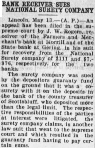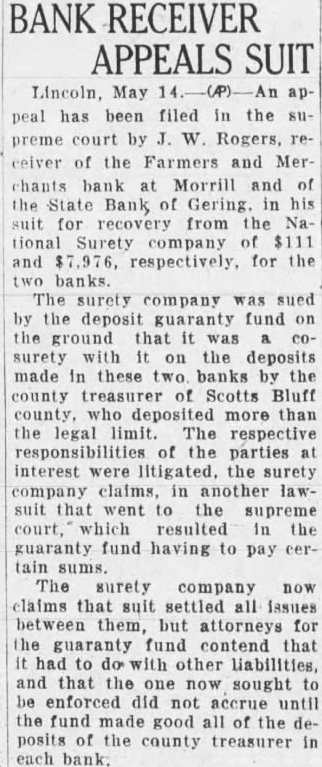 BANK RECEIVER APPEALS SUIT Lincoln, May appeal has been filed in the supreme court by J. W. Rogers, receiver of the Farmers and Merchants bank at Morrill and of the State Bank, of Gering in his suit for recovery from the National Surety company of $111 and $7,976, respectively, for the two banks. The surety company was sued by the deposit guaranty fund on the ground that it was cosurety with it on the deposits made in these two banks by the county treasurer of Scotts Bluff county, who deposited more than the legal limit. The respective responsibilities of the parties at interest were litigated. the surety company claims, in another lawsuit that went to the supreme court, which resulted in the guaranty fund having to pay certain sums. The surety company now claims that suit settled all issues between them, but attorneys for the guaranty fund contend that it had to do with other liabilities, and that the one now sought to be enforced did not accrue until the fund made good all of the deposits of the county treasurer in each bank
