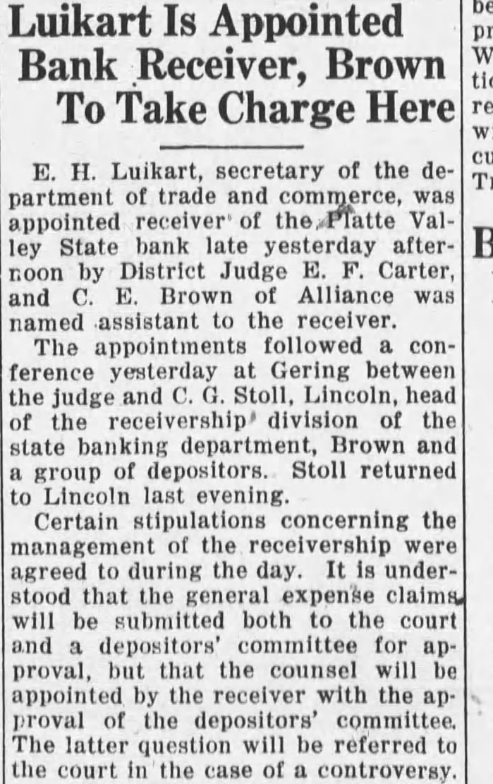 Luikart Is Appointed Bank Receiver, Brown To Take Charge Here Luikart, secretary of the partment trade and commerce, appointed receiver State bank late yesterday by District Judge Carter, and Brown Alliance named assistant to the receiver. The followed yesterday Gering between the and Stoll, Lincoln, division the state Brown group of depositors. Stoll returned Lincoln last evening. Certain stipulations concerning the management of the receivership agreed to during the day. understood that the general expense claims will be submitted both to the court and depositors' committee for proval, but that the counsel will appointed the receiver with the of the depositors' committee. The latter question will be referred the court the case controversy.