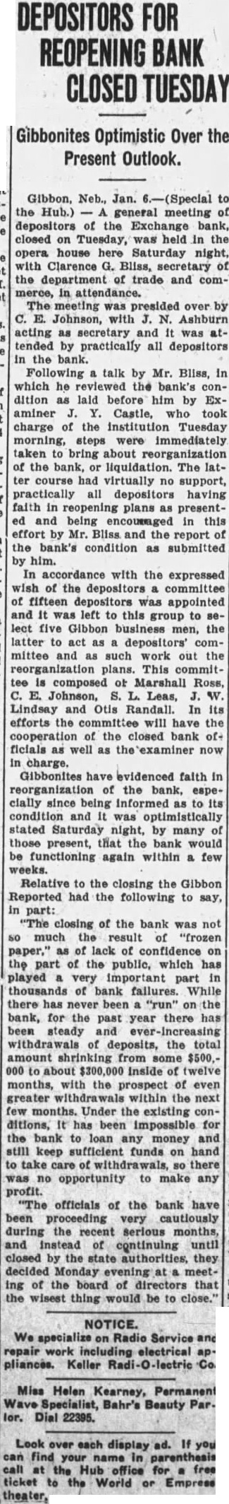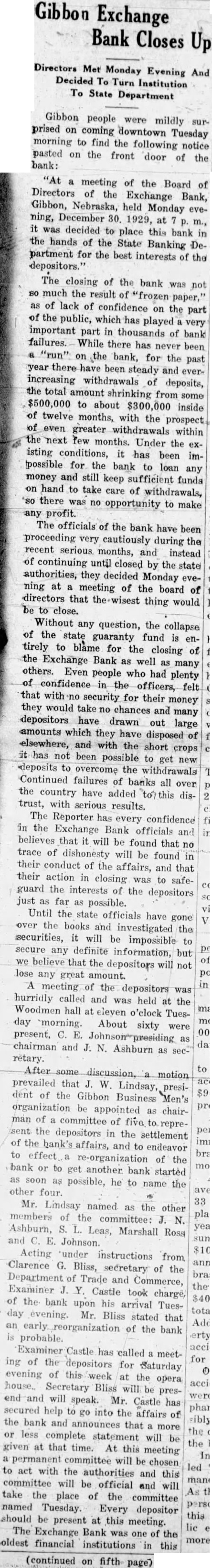 Exchange Closes Directors Met Monday Evening And Decided Institution State Department Gibbon people were mildly surprised on coming downtown Tuesday morning to find the following notice pasted on the front door of the bank: meeting of the Board of Directors of the Exchange Bank, Gibbon, Nebraska, held Monday evening, December 30. 1929, at decided to place this bank in the hands of the State Banking Department for the best interests of the The closing of the bank was much the result of "frozen paper," as of lack of confidence on the part the public, which played important part in thousands of bank failures. there has never been "run" on the bank, for the past year there been steady and everincreasing withdrawals of deposits, the total amount shrinking from some to about inside of twelve months, with the prospect of greater withdrawals within next few months. Under the isting conditions, it has been possible for the bank to loan any money and still keep sufficient funds on hand to take care of withdrawals, there was no opportunity to make profit. The officials of the bank have been proceeding very cautiously during the recent serious, months, and instead of continuing until closed by the state authorities, they decided Monday evening at meeting of the board of directors that thing would to close. Without any question, the collapse of the state guaranty fund is tirely to blame for the closing of the Exchange Bank as well as many others. Even people who had plenty confidence the officers, that security for their money they would take no chances and many depositors have drawn out large amounts which they have disposed of elsewhere, and with the short has not been possible to get deposits to overcome the withdrawals Continued failures of banks all over the country have added distrust, with serious results. The Reporter has every confidence in the Exchange Bank officials and in believes that will be found that no trace of dishonesty will be found in their conduct of the affairs, and that their action in closing was to safeguard the interests of the depositors just as far possible. Until the state officials have gone the books and investigated the securities, will be impossible secure any definite information, believe that the depositors will not lose any great amount. meeting of the depositors was hurridly called and was held at the Woodmen hall eleven o'clock Tuesday morning. About sixty were present, chairman and Ashburn as secretary. motion prevailed that W. Lindsay, president of the Gibbon Business organization be appointed chairman of committee of five to sent the depositors in the settlement of the hank's affairs, and to endeavor to re-organization of the bank or to get another bank started soon possible, he to name the other four. Mr. Lindsay named as the other members of the committee: N. year Ashburn, Leas, Marshall Ross and Johnson. Acting "under instructions from Clarence Bliss, secretary of the Department of Trade and Commerce, Examiner Castle took charge, of the bank upon his arrival Tuestotal day evening. Mr. Bliss stated that an of the bank probable. Examiner Castle has called meetfor ing of the depositors for Saturday evening of at the opera house. Secretary Bliss will be presand will speak. Mr. Castle has secured help to go into the affairs of the bank and announces that more or less complete statement will the given at that time. At this meeting permanent committee will be chosen led to act with the authorities and this committee will be official and will take place of the committee named Tuesday. Every depositor should be present at this meeting. The Exchange Bank was one of the more oldest financial institutions this (continued on