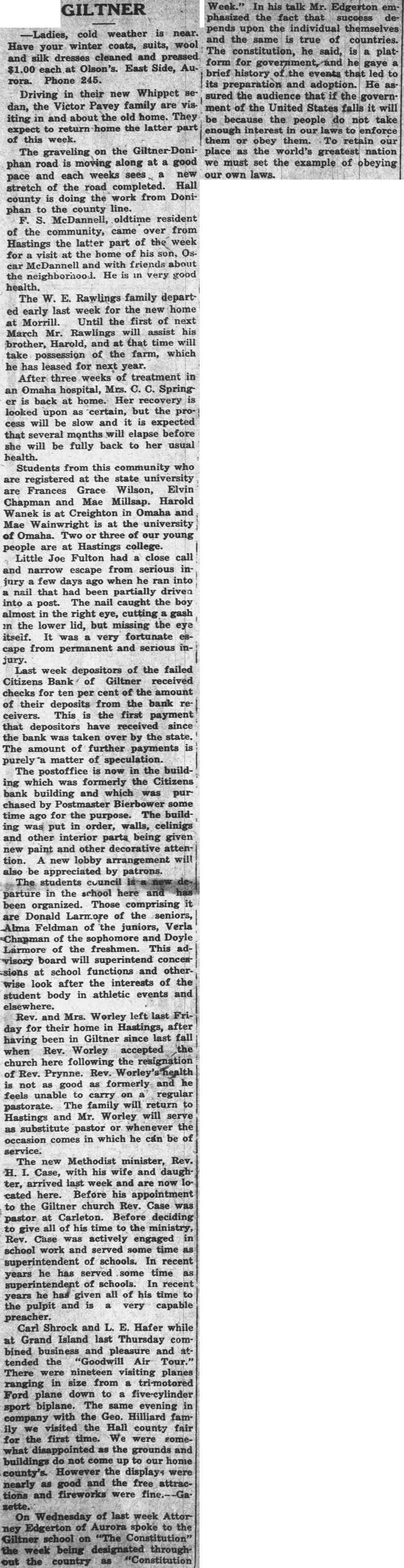 GILTNER -Ladies, cold weather is near. Have your winter coats, suits, wool and silk dresses cleaned and pressed $1.00 each at Olson's. East Side, Aurora. Phone 245. Driving in their new Whippet sedan, the Victor Pavey family are visiting in and about the old home. They expect to return home the latter part of this week. The graveling on the Giltner-Doniphan road is moving along at a good pace and each weeks sees a new stretch of the road completed. Hall county is doing the work from Doniphan to the county line. F. S. McDannell, oldtime resident of the community, came over from Hastings the latter part of the week for a visit at the home of his son, Oscar McDannell and with friends about the neighborhood. He is in very good health. The W. E. Rawlings family departed early last week for the new home at Morrill. Until the first of next March Mr. Rawlings will assist his brother, Harold, and at that time will take possession of the farm, which he has leased for next year. After three weeks of treatment in an Omaha hospital, Mrs. C. C. Spring er is back at home. Her recovery is looked upon as certain, but the process will be slow and it is expected that several months will elapse before she will be fully back to her usual health. Students from this community who are registered at the state university are Frances Grace Wilson, Elvin Chapman and Mae Millsap. Harold Wanek is at Creighton in Omaha and Mae Wainwright is at the university of Omaha. Two or three of our young people are at Hastings college. Little Joe Fulton had a close call and narrow escape from serious injury a few days ago when he ran into a nail that had been partially driven into a post. The nail caught the boy almost in the right eye, cutting a gash in the lower lid, but missing the eye itself. It was a very fortunate escape from permanent and serious injury. Last week depositors of the failed Citizens Bank of Giltner received checks for ten per cent of the amount of their deposits from the bank receivers. This is the first payment that depositors have received since the bank was taken over by the state. The amount of further payments is purely*a matter of speculation. The postoffice is now in the building which was formerly the Citizens bank building and which was purchased by Postmaster Bierbower some time ago for the purpose. The building was put in order, walls, celinigs and other interior parts being given new paint and other decorative attention. A new lobby arrangement will also be appreciated by patrons. The students council parture in the school here and been organized. Those comprising it are Donald Larmore of the seniors, Alma Feldman of the juniors, Verla Chapman of the sophomore and Doyle Larmore of the freshmen. This advisory board will superintend concessions at school functions and otherwise look after the interests of the student body in athletic events and elsewhere. Rev. and Mrs. Worley left last Friday for their home in Hastings, after having been in Giltner since last fall when Rev. Worley accepted the church here following the resignation of Rev. Prynne. Rev. Worley is not as good as formerly and he feels unable to carry on a regular pastorate. The family will return to Hastings and Mr. Worley will serve as substitute pastor or whenever the occasion comes in which he can be of service. The new Methodist minister, Rev. H. I. Case, with his wife and daughter, arrived last week and are now located here. Before his appointment to the Giltner church Rev. Case was pastor at Carleton. Before deciding to give all of his time to the ministry, Rev. Case was actively engaged in school work and served some time as superintendent of schools. In recent years he has served some time as superintendent of schools. In recent years he has given all of his time to the pulpit and is a very capable preacher. Carl Shrock and L. E. Hafer while at Grand Island last Thursday combined business and pleasure and attended the "Goodwill Air Tour." There were nineteen visiting planes ranging in size from a tri-motored Ford plane down to a five-cylinder sport biplane. The same evening in company with the Geo. Hilliard family we visited the Hall county fair for the first time. We were somewhat disappointed as the grounds and buildings do not come up to our home county's. However the displays were nearly as good and the free attractions and fireworks were fine.-Gazette. On Wednesday of last week Attor ney Edgerton of Aurora spoke to the Giltner school on "The Constitution" the week being designated throughout the country as "Constitution Week." In his talk Mr. Edgerton emphasized the fact that success depends upon the individual themselves and the same is true of countries. The constitution, he said, is a platform for government, and he gave a brief history of the events that led to its preparation and adoption. He sured the audience that if the government of the United States falls it will be because the people do not take enough interest in our laws to enforce them or obey them. To retain our place as the world's greatest nation we must set the example of obeying our own laws.