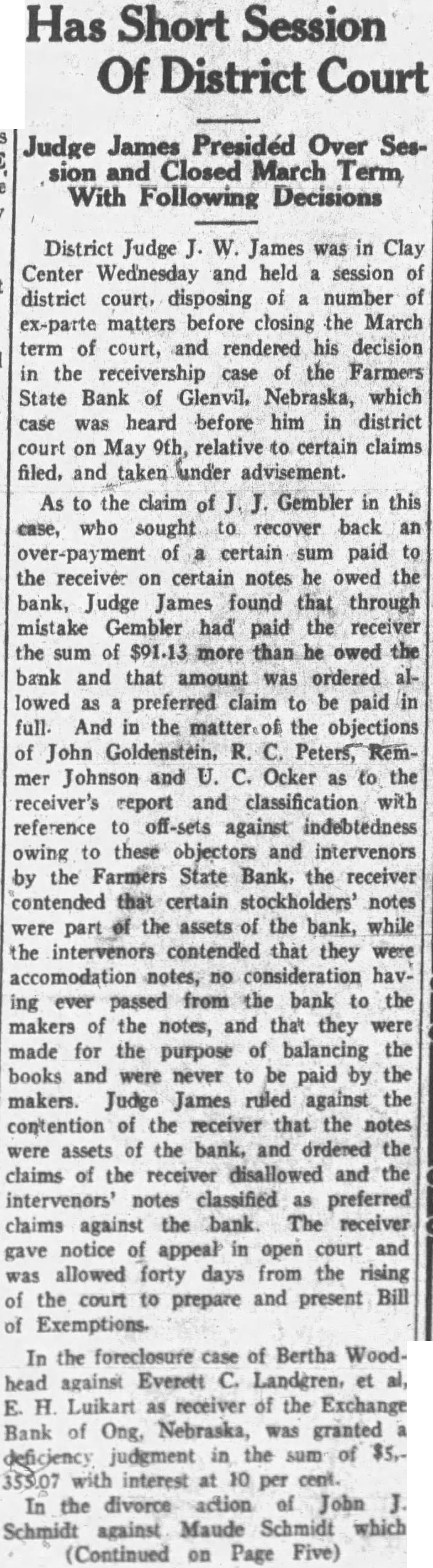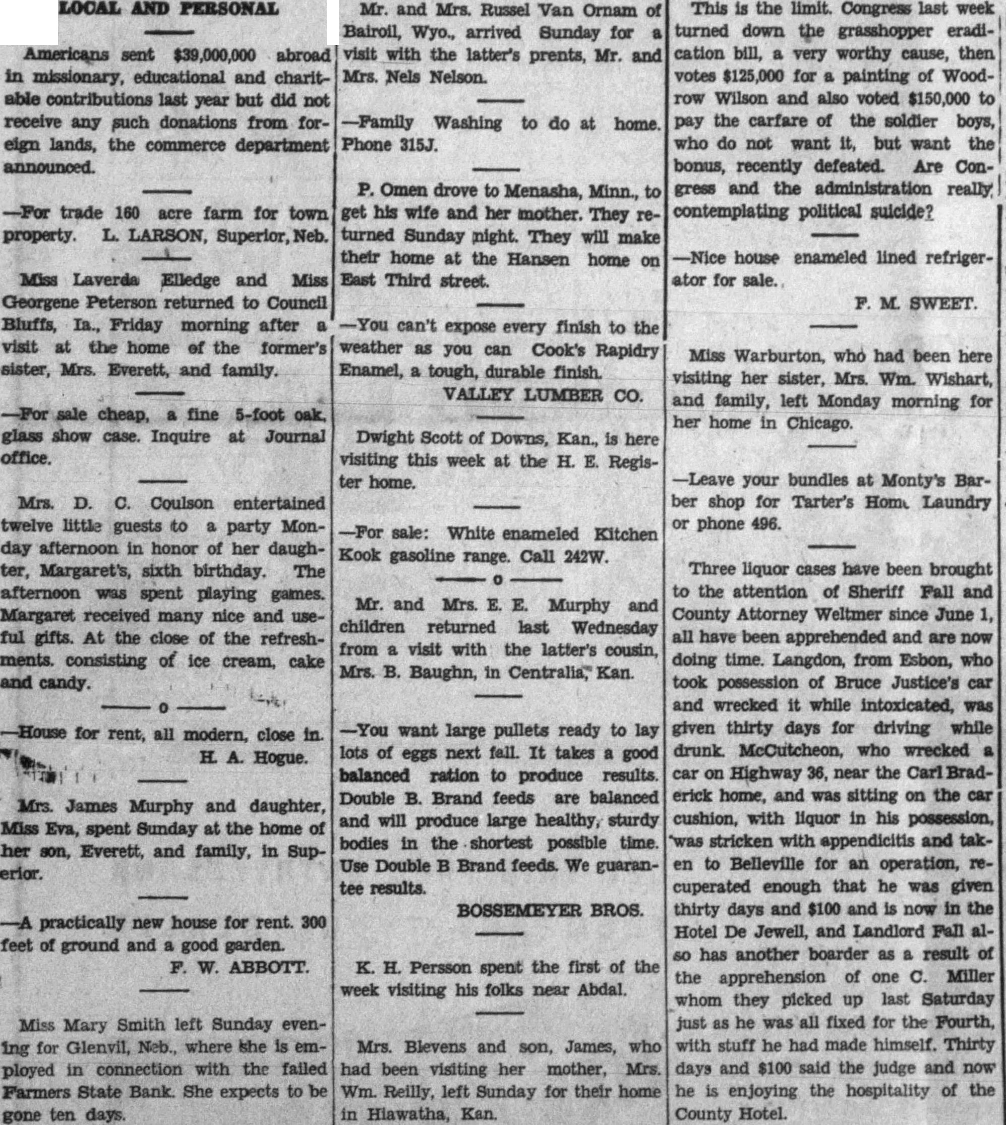 LOCAL AND PERSONAL Americans sent $39,000,000 abroad in missionary, educational and charitable contributions last year but did not receive any such donations from foreign lands, the commerce department announced. -For trade 160 acre farm for town property. L. LARSON, Superior, Neb. Miss Laverda Elledge and Miss Georgene Peterson returned to Council Bluffs, Ia., Friday morning after a visit at the home of the former's sister, Mrs. Everett, and family. -For sale cheap, a fine 5-foot oak. glass show case. Inquire at Journal office. Mrs. D. C. Coulson entertained twelve little guests to a party Monday afternoon in honor of her daughter, Margaret's, sixth birthday. The afternoon was spent playing games. Margaret received many nice and useful gifts. At the close of the refreshments. consisting of ice cream, cake and candy. -House for rent, all modern, close in. H. A. Hogue. Mrs. James Murphy and daughter, Miss Eva, spent Sunday at the home of her son, Everett, and family, in Superior. -A practically new house for rent. 300 feet of ground and a good garden. F. W. ABBOTT. Miss Mary Smith left Sunday evening for Glenvil, Neb., where she is employed in connection with the failed Farmers State Bank. She expects to be gone ten days. Mr. and Mrs. Russel Van Ornam of Bairoil, Wyo., arrived Sunday for a visit with the latter's prents, Mr. and Mrs. Nels Nelson. -Family Washing to do at home. Phone 315J. P. Omen drove to Menasha, Minn., to get his wife and her mother. They returned Sunday night. They will make their home at the Hansen home on East Third street. -You can't expose every finish to the weather as you can Cook's Rapidry Enamel, a tough, durable finish. VALLEY LUMBER CO. Dwight Scott of Downs, Kan., is here visiting this week at the H. E. Register home. This is the limit. Congress last week turned down the grasshopper eradication bill, a very worthy cause, then votes $125,000 for a painting of Woodrow Wilson and also voted $150,000 to pay the carfare of the soldier boys, who do not want it, but want the bonus, recently defeated. Are Congress and the administration really. contemplating political suicide? -Nice house enameled lined refrigerator for sale. F. M. SWEET. Miss Warburton, who had been here visiting her sister, Mrs. Wm. Wishart, and family, left Monday morning for her home in Chicago. -For sale: White enameled Kitchen Kook gasoline range. Call 242W. -Leave your bundles at Monty's Barber shop for Tarter's Home Laundry or phone 496. Mr. and Mrs. E. E. Murphy and children returned last Wednesday from a visit with the latter's cousin, Mrs. B. Baughn, in Centralia, Kan. -You want large pullets ready to lay lots of eggs next fall. It takes a good balanced ration to produce results Double B. Brand feeds are balanced and will produce large healthy, sturdy bodies in the shortest possible time. Use Double B Brand feeds. We guarantee results. BOSSEMEYER BROS. K. H. Persson spent the first of the week visiting his folks near Abdal. Mrs. Blevens and son, James, who had been visiting her mother, Mrs. Wm. Reilly, left Sunday for their home in Hiawatha, Kan. Three liquor cases have been brought to the attention of Sheriff Fall and County Attorney Weltmer since June 1, all have been apprehended and are now doing time. Langdon, from Esbon, who took possession of Bruce Justice's car and wrecked it while intoxicated, was given thirty days for driving while drunk. McCutcheon, who wrecked a car on Highway 36, near the Carl Braderick home, and was sitting on the car cushion, with liquor in his possession, "was stricken with appendicitis and taken to Belleville for an operation, recuperated enough that he was given thirty days and $100 and is now in the Hotel De Jewell, and Landlord Fall also has another boarder as a result of the apprehension of one C. Miller whom they picked up last Saturday just as he was all fixed for the Fourth, with stuff he had made himself. Thirty days and $100 said the judge and now he is enjoying the hospitality of the County Hotel.