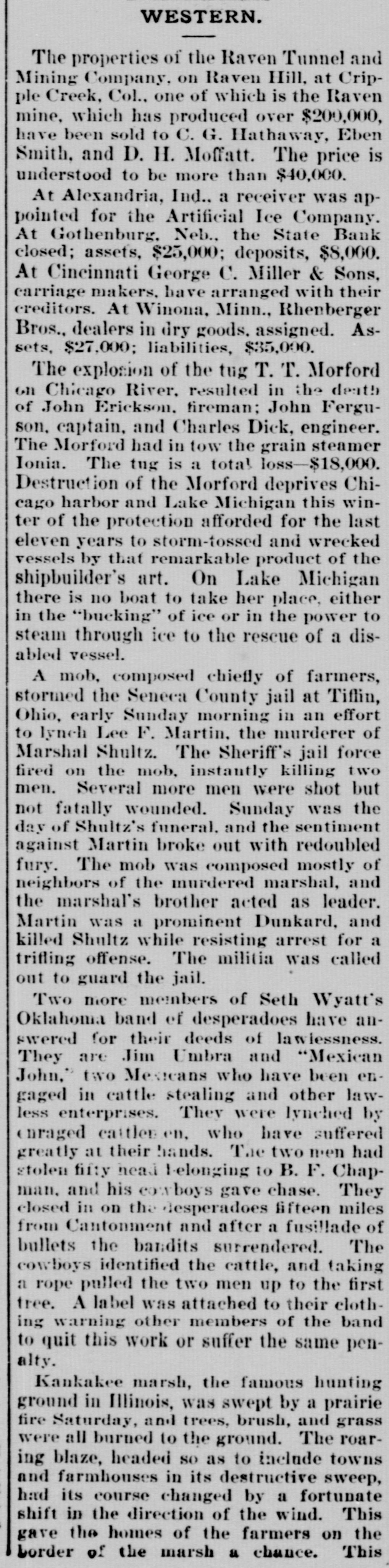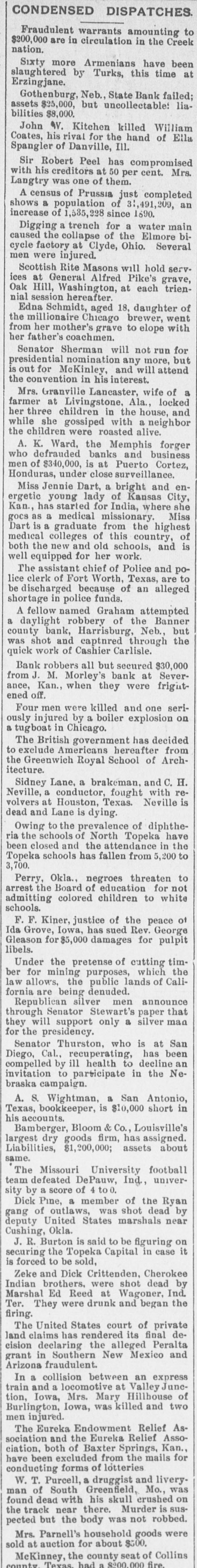 CONDENSED DISPATCHES. Fraudulent warrants amounting to nation. $200,000 are in circulation in the Creek Sixty more Armenians have been slaughtered Erzingjane. by Turks, this time at Gothenburg, Neb., State Bank failed; assets $25,000, but uncollectable: liabilities $8,000. John W. Kitchen killed William Coates, his rival for the hand of Ella Spangler of Danville, Ill. Sir Robert Peel has compromised with his creditors at 50 per cent. Mrs. Langtry was one of them. A census of Prussia just completed shows a population of 31,491,209, an increase of 1,585,228 since 1690. Digging a trench for a water main caused the collapse of the Elmore bicycle factory at Clyde, Ohio. Several men were injured. Scottish Rite Masons will hold services at General Alfred Pike's grave, Oak Hill, Washington, at each triennial session hereafter. Edna Schmidt, aged 18, daughter of the millionaire Chicago brewer, went from her mother's grave to elope with her father's coachmen. Senator Sherman will not run for presidential nomination any more, but is out for McKinley, and will attend the convention in his interest. Mrs. Granville Lancaster, wife of a farmer at Livingstone, Ala., locked her three children in the house, and while she gossiped with a neighbor the children were roasted alive. A. K. Ward, the Memphis forger who defrauded banks and business men of $340,000, is at Puerto Cortez, Honduras, under close surveillance. Miss Jennie Dart, a bright and energetic young lady of Kansas City, Kan., has started for India, where she goes as a medical missionary. Miss Dart is a graduate from the highest medical colleges of this country, of both the new and old schools, and is well equipped for her work. The assistant chief of Police and police clerk of Fort Worth, Texas, are to be discharged because of an alleged shortage in police funds. A fellow named Graham attempted a daylight robbery of the Banner county bank, Harrisburg, Neb., but was shot and captnred through the quick work of Cashier Carlisle. Bank robbers all but secured $30,000 from J. M. Morley's bank at Severance, Kan., when they were frigutened off. Four men were killed and one seriously injured by a boiler explosion on a tugboat in Chicago. The British government has decided to exclude Americans hereafter from the Greenwich Royal School of Architecture. Sidney Lane, a brakeman, and C. H. Neville, a conductor, fought with revolvers at Houston, Texas. Neville is dead and Lane is dying. Owing to the prevalence of diphtheria the schools of North Topeka have been closed and the attendance in the Topeka schools has fallen from 5,200 to 3,700. Perry, Okla., negroes threaten to arrest the Board of education for not admitting colored children to white schools. F. F. Kiner, justice of the peace of Ida Grove, Iowa, has sued Rev. George Gleason for $5,000 damages for pulpit libels. Under the pretense of cutting timber for mining purposes, which the law allows, the public lands of California are being denuded. Republican silver men announce through Senator Stewart's paper that they will support only a silver man for the presidency. Senator Thurston, who is at San Diego, Cal., recuperating, has been compelled by ill health to decline an invitation to participate in the Nebraska campaign. A. S. Wightman, a San Antonio, Texas, bookkeeper, is $10,000 short in his accounts. Bamberger, Bloom & Co., Louisville's largest dry goods firm, has assigned. Liabilities, $1,200,000; assets about same. The Missouri University football team defeated DePauw, Ind., university by a score of to 0. Dick Pine, a member of the Ryan gang of outlaws, was shot dead by deputy United States marshals near Cushing, Okla. J. R. Burton is said to be figuring on securing the Topeka Capital in case it is forced to be sold, Zeke and Dick Crittenden, Cherokee Indian brothers, were shot dead by Marshal Ed Reed at Wagoner, Ind. Ter. They were drunk and began the firing. The United States court of private land claims has rendered its final decision declaring the alleged Peralta grant in Southern New Mexico and Arizona fraudulent. In a collision between an express train and a locomotive at Valley Junetion, Iowa, Mrs. Mary Hillhouse of Burlington, Iowa, was killed and two men injured. The Eureka Endowment Relief Association and the Eureka Relief Association, both of Baxter Springs, Kan., have been excluded from the mails for conducting forms of lotteries W. T. Purcell, a druggist and liveryman of South Greenfield, Mo., was found dead with his skull erushed on the track near there. Murder is suspected but the body was not robbed. Mrs. Parnell's household goods were sold at auction for about $500. McKinney, the county seat of Collins county Texas had $200 fire.