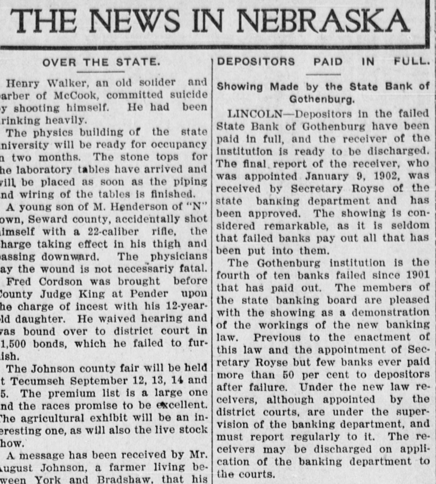 THE NEWS IN NEBRASKA DEPOSITORS PAID IN FULL. OVER THE STATE. Henry Walker, an old solider and Showing Made by the State Bank of arber of McCook, committed suicide Gothenburg. shooting himself. He had been LINCOLN-Depositors in the failed rinking heavily. State Bank of Gothenburg have been The physics building of the state paid in full, and the receiver of the niversity will be ready for occupancy institution is ready to be discharged. two months. The stone tops for The final report of the receiver, who laboratory tables have arrived and was appointed January 9, 1902, was vill be placed as soon as the piping received by Secretary Royse of the wiring of the tables is finished. state banking department and has A young son of M. Henderson of "N" been approved. The showing is conSeward county, accidentally shot sidered remarkable, as it is seldom imself with a 22-caliber rifle, the that failed banks pay out all that has harge taking effect in his thigh and been put into them. assing downward. The physicians The Gothenburg institution is the the wound is not necessariy fatal. fourth of ten banks failed since 1901 Fred Cordson was brought before that has paid out. The members of County Judge King at Pender upon the state banking board are pleased he charge of incest with his 12-yearwith the showing as a demonstration daughter. He waived hearing and of the workings of the new banking bound over to district court in law. Previous to the enactment of 1,500 bonds, which he failed to furthis law and the appointment of Secretary Royse but few banks ever paid The Johnson county fair will be held more than 50 per cent to depositors Tecumseh September 12, 13, 14 and after failure. Under the new law reThe premium list is a large one ceivers, although appointed by the the races promise to be excellent. district courts, are under the superThe agricultural exhibit will be an invision of the banking department, and eresting one, as will also the live stock must report regularly to it. The rehow. ceivers may be discharged on appliA message has been received by Mr. cation of the banking department to August Johnson, a farmer living bethe courts. ween York and Bradshaw, that his
