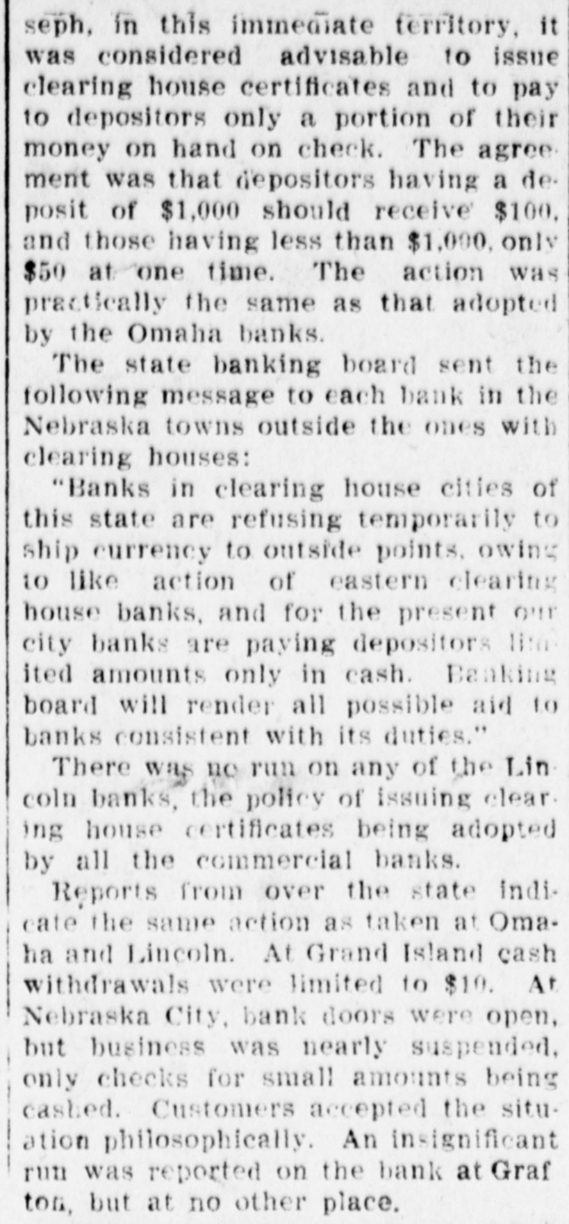 seph, in this immediate territory, it was considered advisable to issue clearing house certificates and to pay to depositors only a portion of their money on hand on check. The agree. ment was that depositors having a deposit of $1,000 should receive $100. and those having less than $1,000, only $50 at one time. The action was practically the same as that adopted by the Omaha banks. The state banking board sent the following message to each bank in the Nebraska towns outside the ones with clearing houses: "Banks in clearing house cities of this state are refusing temporarily to ship currency to outside points. owing to like action of eastern clearing house banks, and for the present our city banks are paying depositors lime ited amounts only in cash. Banking board will render all possible aid to banks consistent with its duties." There was no run on any of the Lin coln banks, the policy of issuing clear. ing house certificates being adopted by all the commercial banks. Reports from over the state indicate the same action as taken at Omaha and Lincoln. At Grand Island cash withdrawals were limited to $10. At Nebraska City, bank doors were open, but business was nearly suspended, only checks for small amounts being cashed. Customers accepted the situation philosophically. An insignificant run was reported on the bank at Graf ton, but at no other place.