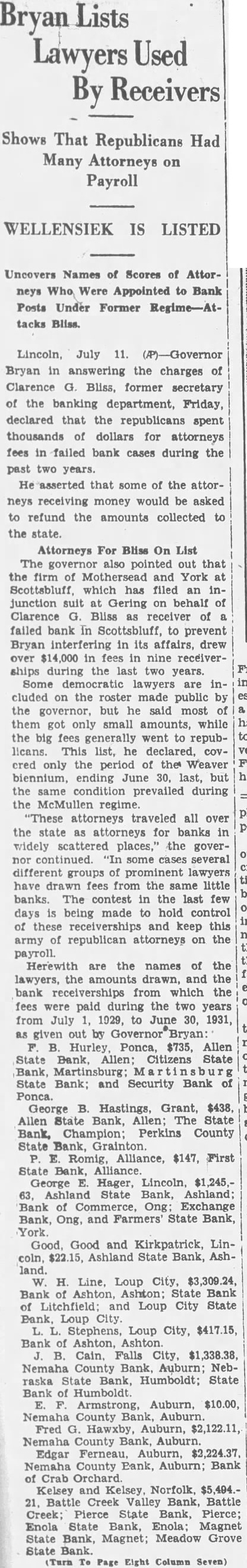 Receivers By Shows That Had Republicans Many Attorneys on Payroll WELLENSIEK IS LISTED Uncovers Names of Scores of Attorneys Who Were Appointed to Bank Posts Under Former tacks Bliss. Lincoln, July Bryan in answering the charges Clarence Bliss, former secretary of the banking department, Friday, declared that the republicans spent thousands dollars for attorneys fees in failed bank cases during the past two years. asserted that some of the attorneys receiving money would be asked to refund the amounts collected the state. Attorneys For Bliss On List The also pointed out that firm of Mothersead and Scottsbluff, which has filed an junction Gering on behalf of Clarence Bliss receiver of failed bank in Scottsbluff, to prevent Bryan interfering in its affairs, drew fees in nine receiverduring the last two years. Some democratic lawyers are cluded the roster made public the but he said most got only small amounts, while the big fees went to republicans. This list, he covcred only the period the Weaver biennium, ending June 30, last, the same condition prevailed during the McMullen regime. attorneys traveled all over the state for banks widely scattered places," the govercontinued. several different groups prominent lawyers have fees from the same little banks. The contest the last few days being made hold control these and keep this army republican attorneys on the payroll. Herewith are the names of the lawyers, drawn, the bank receiverships from which fees paid during the two years from July to June 30, 1931, given out by Ponca, $735, Allen State Bank, Allen: Citizens State Bank, State Bank; and Security Bank Ponca. George Hastings, Grant, $438, Allen State Bank, Allen; The State Bank, Champion; Perkins County State Bank, Grainton. Romig, Alliance, $147, First Bank, Alliance George Hager, Lincoln, $1,245,State Bank, Commerce, Ong: Exchange Bank, Ong, and Farmers State Bank, Good, Good and Kirkpatrick, Lincoln, Ashland State Bank, Line, Loup City, Bank Ashton, Bank Litchfield: and Loup City State Loup City. Stephens, Loup City, $417.15, Ashton, Cain. Falls City, $1,338.38, Nemaha Bank, Nebraska Bank, State Auburn, $10.00, County Bank, Auburn. Fred Auburn, Nemaha County Bank, Edgar Ferneau, County Bank, Auburn; Bank Crab Orchard Kelsey Kelsey, Norfolk, Battle Creek Valley Bank, Battle Creek; State Bank, Pierce; Enola State Bank, Magnet Bank, Magnet; Meadow Grove Bank. (Turn Page Eight Column Seven)