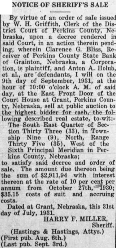 NOTICE OF SHERIFF'S SALE By virtue of an order of sale issued H. Griffith, Clerk of the District Court of Perkins County, braska, upon decree rendered said Court, in an action therein pending, wherein Clarence Bliss, ceiver County State Bank Grainton, Nebraska, Corporation, plaintiff, and Anton defendants, on the 9th day of September, 1931, the hour 10:00 o'clock of said day, the East Front Door of the Court House at Grant, Perkins Nebraska, sell at public highest for cash, the lowing real estate, The South East Quarter tion Thirty Three (33), Township Nine (9), North, Range Thirty Five (35), West of the Sixth Principal Meridian in Perkins County, Nebraska; satisfy said decree order sale. The amount thereon being sum $2,911.94 with interest thereon the rate 10 per from October $35.15 costs of suit and accruing Dated at Grant, Nebraska, this 31st day of July, 1931. HARRY Sheriff. (Hastings Hastings, Attys.) Sept.