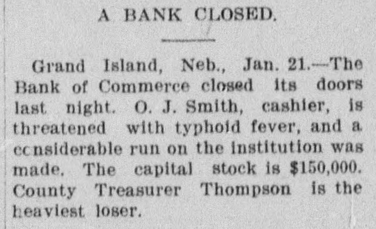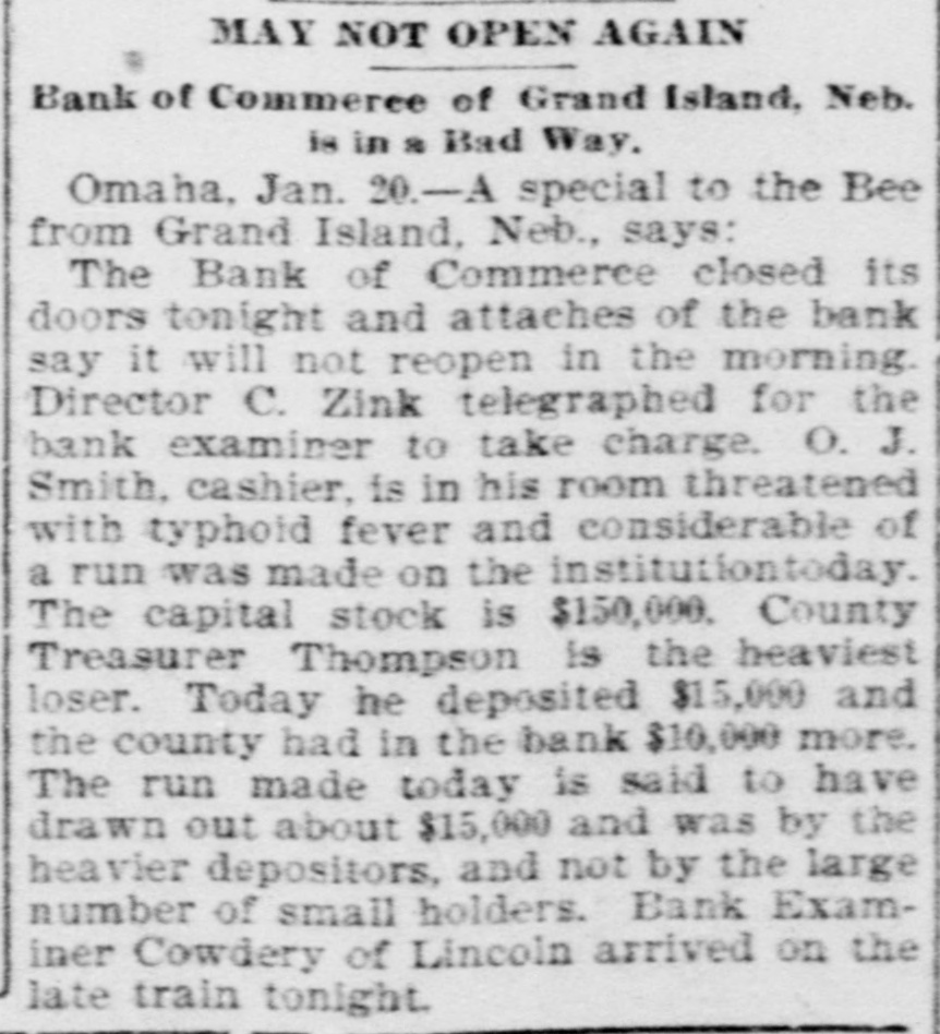 MAY NOT OPEN AGAIN Bank of Commerce of Grand Island, Neb. is in a Bad Way. Omaha, Jan. 20.-A special to the Bee from Grand Island, Neb., says: The Bank of Commerce closed its doors tonight and attaches of the bank say it will not reopen in the morning. Director C. Zink telegraphed for the bank examiner to take charge. O. J. Smith, cashier, is in his room threatened with typhoid fever and considerable of a run was made on the institutiontoday. The capital stock is $150,000. County Treasurer Thompson is the heaviest loser. Today he deposited $15,000 and the county had in the bank $10,000 more. The run made today is said to have drawn out about $15,000 and was by the heavier depositors, and not by the large number of small holders. Bank Examiner Cowdery of Lincoln arrived on the late train tonight.