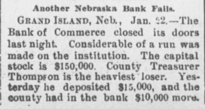 Grand Island, Neb. Bank Fails. GRAND ISLAND, Neb., Jan. 21.-The Bank of Commerce closed its doors last night. Considerable of a run was made on the institution. The capital stock is $150,000. County Treasurer Thompson is the heaviest loser. Yesterday he deposited $15,000, and the county had in the bank $10,000 more.