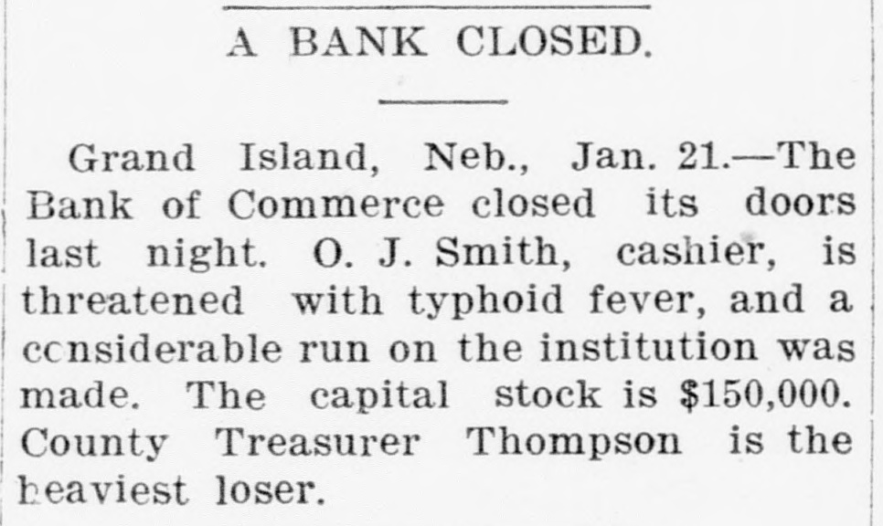 A BANK CLOSED. Grand Island, Neb., Jan. 21.-The Bank of Commerce closed its doors last night. O. J. Smith, cashier, is threatened with typhoid fever, and a. ecnsiderable run on the institution was made. The capital stock is $150,000. County Treasurer Thompson is the heaviest loser.