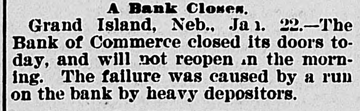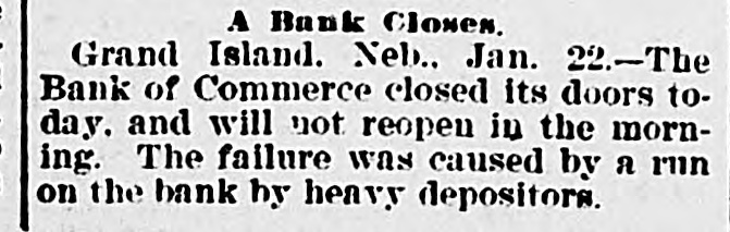A Bank Closes, Grand Island, Neb., Ja 1. 22.-The Bank of Commerce closed its doors today, and will not reopen n the morning. The failure was caused by a run on the bank by heavy depositors.