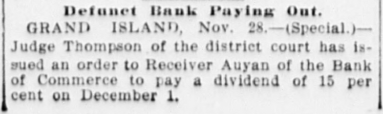 Defunct Bank Paying Out. GRAND ISLAND, Nov. 28.-(Special.)Judge Thompson of the district court has issued an order to Receiver Auyan of the Bank of Commerce to pay a dividend of 15 per cent on December 1.