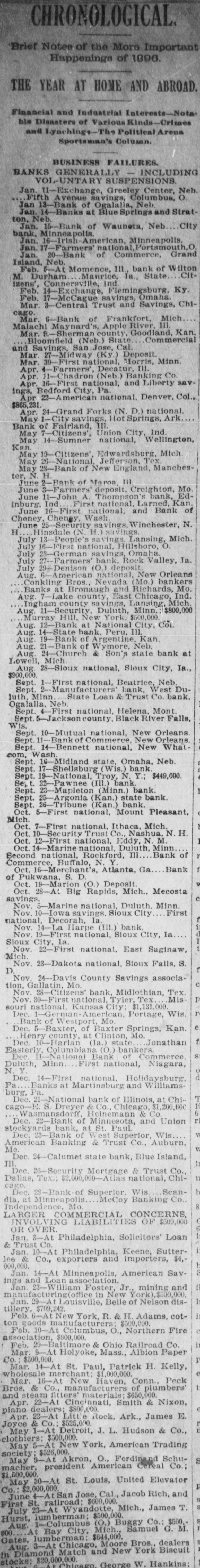 Financial and Industrial Interests-Notabie Disasters of Various Kinds-Crimes and Lynchings-The Political Arena Sportsman's Column. BUSINESS FAILURES. BANKS GENERALLY - INCLUDING VOL-UNTARY SUSPENSIONS. Jan. II-Exchange, Greeley Center, Neb. Fifth Avenue savings, Columbus, O. Jan 13-Bank of Ogalalia, Neb. Jan. 14-Banks at Blue Springs and Stratton, Neb. Jan. 15-Bank of Wauneta, Neb City bank, Minneapolis. Jan. 16-Irish-American, Minneapolis. Jan. 17-Farmers' national, Portsmouth Jan. 20-Bank of Commerce, Grand Island, Neb. Feb. 6-At Momence, III, bank of Wilton M. Durham Maurice, Ia., State Citizens', Connersville, Ind Feb. 14-Exchange, Flemingsburg, Ky. Feb. 17-McCague savings, Omaha. Mar. 3-Central Trust and Savings, Chicago. Mar. 6-Bank of Frankfort, Mich Malachi Maynard's, Apple River, III. Mar. -Sherman county, Goodland, Kan. Bloomfield (Neb.) State Commercial and Savings, San Jose, Cal. Mar. 27-Midway (Ky.) Deposit. Mar. 30-First national, Morris, Minn. Apr. 4-Farmers', Decatur, III. Apr. 11-Chadron (Neb.) Banking Co. Apr. 16-First national, and Liberty savings, Bedford City, Pa. Apr 22-American national, Denver, Col., $865,231. Apr. 24-Grand Forks (N. D.) national. May 1--City savings. Hot Springs, Ark Bank of Fairland, III. May 7-Citizens', Union City, Ind. May 14-Sumner national, Wellington, Kan. May 19-Citizens', Edwardsburg. Mich. May 26-National, Jefferson, Tex. May 28-Bank of New England, Manchester, N. H. June 2-Bank of Maroa, 111 June 3-Farmers' deposit, Creighton, Mo. June 11-John A. Thompson's bank, Edinburg. Ind First national, Larned, Kan. June 16-First national, and Bank of Cheney, Chency, Wash June 25-Security savings, Winchester, N. H Hinsdale (N. H savings. July 13-People's savings. Lansing, Mich. July 16-First national, Hillsboro, O. July 23-German savings, Omaha. July 27--Farmers' bank, Rock Valley, Ta. July 29-Denison (O.) deposit. Aug. 6-American national, New Orleans Conkling Bros., Nevada (Mo.) bankers Banks at Bronaugh and Richards, Mo. Aug. 7-Lake county, East Chicago, Ind. Ingham county savings, Lansing, Mich. Aug. 11-Security, Duluth, Minn. $800,000 Murray Hill, New York. $500,000. Aug. 12-Bank at National City, Col. Aug. 14-State bank. Peru. III. Aug. 19-Bank of Argentine, Kan. Aug. 21-Bank of Wymore, Neb. Aug. 24-Church & Son's state bank at Lowell, Mich Aug 28-Sloux national. Sloux City, Ia., $900,000. Sept. 1-First national, Beatrice, Neb. Sept. 2--Manufacturers' bank, West Duluth, Minn State Loan & Trust Co. bank. Ogalalla, Neb. Sept. 4-First national, Helena. Mont. Sept. 5-Jackson county. Black River Falls, Wis. Sept. 10-Mutual national, New Orleans. Sept. 11-Bankof Commerce, New Orleans. Sept. 14-Bennett national, New Whatcom, Wash Sept. 16-Midland state, Omaha, Neb. Sept. 17-Shellsburg (Wis.) bank. Sept. 19-National, Troy, N. Y.; $449,000. Sei. t. 22-Pawnee (III.) bank. Sept. 23-Mapleton (Minn.) bank. Sept. 25-Argonia (Kan.) state bank. Sept. 26-Tribune (Kan.) bank. Oct. 5-First national, Mount Pleasant, Mich. Oct. 7-First national, Ithaca, Mich Oct. 10-Security Trust Co., Nashua, N. H. Oct. 12-First national, Eddy, N. M. Oct. 14-Marine national, Duluth, Minn Bank of r Second national, Rockford. III Commerce, Buffalo, N. Y. 1 Bank Oct. 16-Merchant's, Atlanta, Ga of Pukwana, S. D. < Oct. 19-Marion (O.) Deposit. Oct. 28-At Big Rapids, Mich., Mecosta c savings. Nov. 5-Marine national, Duluth. Minn. Nov. 10-Iowa savings, Sioux City First national, Decorah, Ia. 1 Nov. 14-La Harpe (111.) bank. 4 Nov. 19-First national, Sioux City, Ia Sioux City, la. Nov. 22-First national, East Saginaw, Mich Nov. 23-Dakota national, Sloux Falls, S. f D. Nov. 24-Davis County Savings associaC tion, Gallatin, Mo. Nov. 28-Citizens' bank, Midlothian, Tex. Mis D Nov. 30-First national, Tyler, Tex souri national. Kansas City: $1,131,000 r Dec. 1-German-American, Portage, Wis. Bank of Westport, Mo. e Dec. Baxter, of Baxter Springs, Kan. Henry county, at Clinton, Mo. f Dec. 10-Harlan (la.) state Jonathan Easterly, Columbiana (O.) bankers. S Dec 11 National Bank of Commerce, Duluth, Minn First national, Niagara, 0 N.Y. a Dec. 14-First national, Holidaysburg. Pa Banks at Martinsburg and Williamsburg, Pa. Dec. 21-National bank of Illinois, at Chi1 cago-E. S. Dreyer & Co., Chicago, $1,200,600 6 Wasmansdorff, Heinemann & Co. r Dec. 22-Bank of Minnesota, and Union stockyards bank, at St. Paul. W Dec. 23-Bank of West Superior, Wis American Banking & Trust Co., Auburn. V Me. Dec. 24-Calumet state bank, Blue Island, 1 III. Dec. 26-Security Mortgage & Trust Co., n Dallas, Tex.; $2,000,000-Atlas national, Chicago. Dec. 28-Bank.of Superior. Wis Scan-