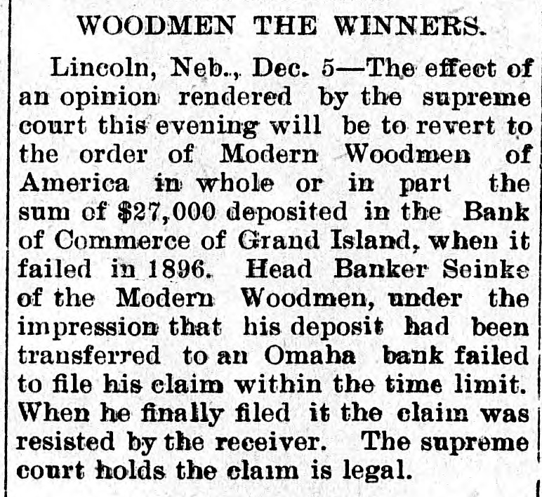 WOODMEN THE WINNERS. Lincoln, Neb., Dec. 5-The effect of an opinion rendered by the supreme court this evening will be to revert to the order of Modern Woodmen of America in whole or in part the sum of $27,000 deposited in the Bank of Commerce of Grand Island, when it failed in 1896. Head Banker Seinke of the Modern Woodmen, under the impression that his deposit had been transferred to an Omaha bank failed to file his claim within the time limit. When he finally filed it the claim was resisted by the receiver. The supreme court holds the claim is legal.