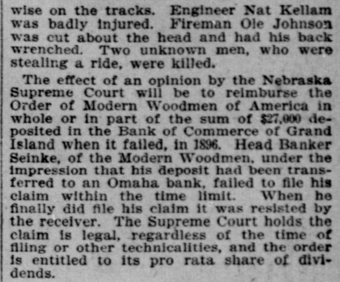 wise on the tracks. Engineer Nat Kellam was badly injured. Fireman Ole Johnson was cut about the head and had his back wrenched. Two unknown men, who were stealing a ride, were killed. The effect of an opinion by the Nebraska Supreme Court will be to reimburse the Order of Modern Woodmen of America in whole or in part of the sum of $27,000 deposited in the Bank of Commerce of Grand Island when it failed, in 1896. Head Banker Seinke, of the Modern Woodmen, under the impression that his deposit had been transferred to an Omaha bank, failed to file his claim within the time limit. When he finally did file his claim it was resisted by the receiver. The Supreme Court holds the claim is legal, regardless of the time of filing or other technicalities, and the order is entitled to its pro rata share of dividends.