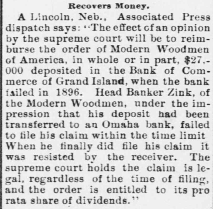 Recovers Money. A Lincoln, Neb., Associated Press dispatch says: "The effect of an opinion by the supreme court will be to reimburse the order of Modern Woodmen of America, in whole or in part, $27,000 deposited in the Bank of Commerce of Grand Island, when the bank failed in 1896. Head Banker Zink, of the Modern Woodmen, under the impression that his deposit had been transferred to an Omaha bank, failed to file his claim within the time limit When he finally did file his claim it was resisted by the receiver. The supreme court holds the claim is legal, regardless of the time of filing, and the order is entitled to its pro rata share of dividends."