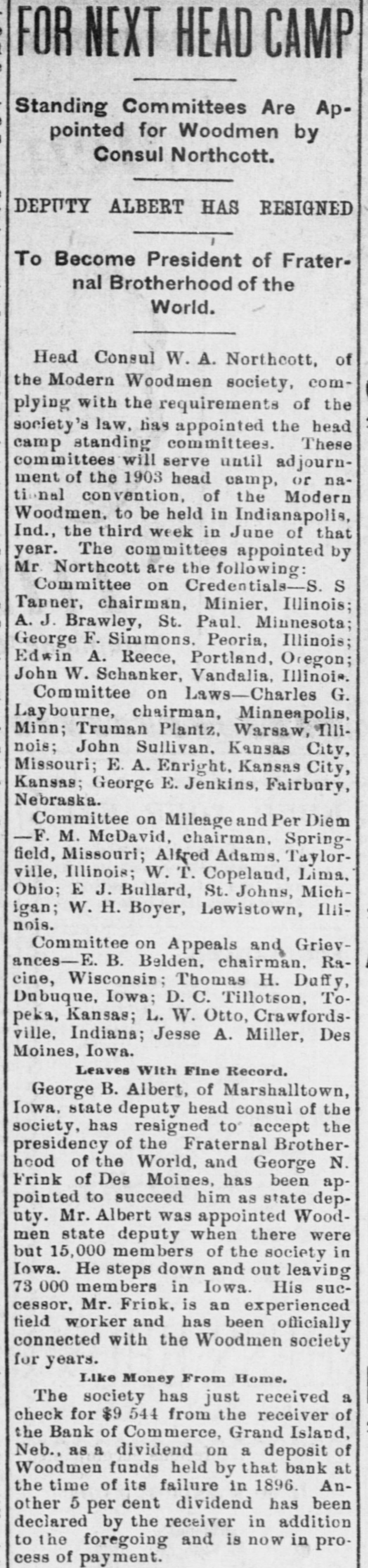 FOR NEXT HEAD CAMP Standing Committees Are Appointed for Woodmen by Consul Northcott. DEPUTY ALBERT HAS RESIGNED To Become President of Fraternal Brotherhood of the World. Head Consul W.A. Northcott, of the Modern Woodmen society, complying with the requirements of the society's law, has appointed the head camp standing committees. These committees will serve until adjournment of the 1903 head camp, or national convention, of the Modern Woodmen. to be held in Indianapolis, Ind., the third week in June of that year. The committees appointed by Mr. Northcott are the following: Committee on Credentials-S. S Tanner, chairman, Minier, Illinois; A. J. Brawley, St. Paul. Minnesota; George F. Simmons. Peoria, Illinois; Edwin A. Reece, Portland, Oregon; John W. Schanker, Vandalia, Illinois. Committee on Laws-Charles G. Laybourne, chairman, Minneapolis, Minn; Truman Plantz, Warsaw, Illinois; John Sullivan. Kansas City, Missouri; E. A. Enright, Kansas City, Kansas; George E. Jenkins, Fairbury, Nebraska. Committee on Mileage and Per Diem -F. M. McDavid, chairman, Springfield, Missouri; Alfred Adams. Taylorville, Illinois; W. T. Copeland, Lima, Ohio; E J. Bullard, St. Johns, Michigan; W. H. Boyer, Lewistown, Illinois. Committee on Appeals and Grievances-E. B. Belden, chairman. Racine, Wisconsin: Thomas H. Duffy, Dubuque, Iowa; D. C. Tillotson, Topeka, Kansas; L. W. Otto, Crawfordsville, Indiana; Jesse A. Miller, Des Moines, Iowa. Leaves With Fine Record. George B. Albert, of Marshalltown, Iowa, state deputy head consul of the society, has resigned to accept the presidency of the Fraternal Brotherhood of the World, and George N. Frink of Des Moines, has been appointed to succeed him as state deputy. Mr. Albert was appointed Woodmen state deputy when there were but 15,000 members of the society in Iowa. He steps down and out leaving 73 000 members in Iowa. His successor, Mr. Frink, is an experienced field worker and has been officially connected with the Woodmen society for years. Like Money From Home. The society has just received a check for $9 544 from the receiver of the Bank of Commerce, Grand Island, Neb., as a dividend on a deposit of Woodmen funds held by that bank at the time of its failure in 1896. Another 5 per cent dividend has been declared by the receiver in addition to the foregoing and is now in process of payment.