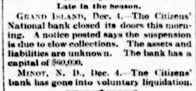 Late in the Season. GRAND ISLAND, Dec. 4. -The Citizens' National bank closed its doors this morning. A notice posted says the suspension is due to slow collections. The assets and liabilities are unknown. The bank has a capital of $60,000. MINOT. N. D., Dec. 4. The Citizens bank has gone into voluntary liquidation.