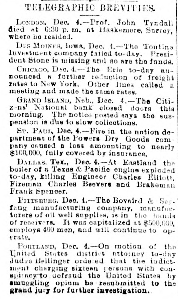 TELEGRAPHIC BREVITIES LONDON. Dec. 4.-Prof. John Tyndall died at 6:30 p. ID. at Haskemere, Surrey, where be resided. DFS MOINES, Iowa, Dec. 4.-The Tontine Investment company failed to-day. President Stone is missing and so are the funds. CHICAGO, Dec. 4.-The Erio to-day announced a further reduction of freight rates to New York. Other linea called a meeting and made the same rates. GRAND ISLAND, Neb., Dec. 4.-The Citizens' National bank closed doors this morning. The notice posted says the suspension is due to slow collections. ST. PAUL, Dec. 4.-Fire in the notion department of the Powers Dry Goods com pany caused a loss amounting to nearly $100,000, fully covered by insurance. DALLAS. Tex., Dec. 4.-At Eastland the boiler of 8 Texas & Pacific engine exploded to-day. killing Engineer Charles Elliott. Fireman Charles Beevers and Brakeman Frank Spencer. PITTSBURG, Dec. 4.-The Bovaird & Sey. faug manufacturing company, manufac. turers of oil well supplies. is in the hands of receivers. It was capitalized nt $500,000, employs 400 men, and will continue to operate. PORTLAND, Dec. 4.-On motion of the United States district attorney to-day Judve Bellinger orde ed that the indictment charging sixteen persons with conspirney to defraud the United States by smuggling opium be resubmitted to the grand jury for further investigation.