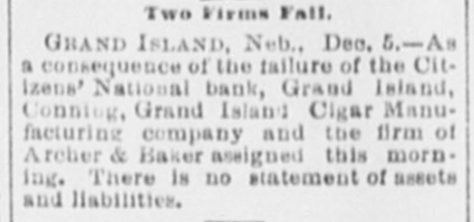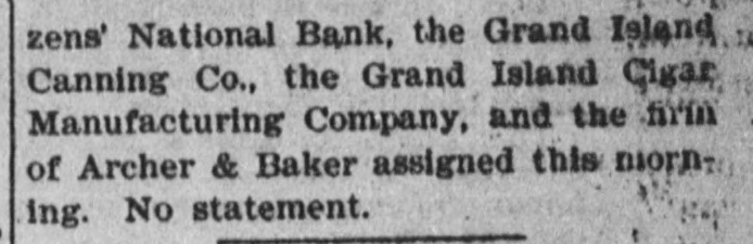zens' National Bank, the Grand Island Canning Co., the Grand Island Gigar Manufacturing Company, and the firm of Archer & Baker assigned this morning. No statement.