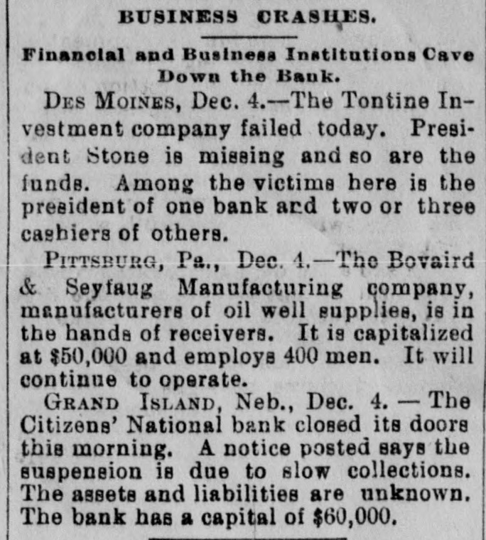BUSINESS CRASHES. Financial and Business Institutions Cave Down the Bank. DES MOINES, Dec. 4.-The Tontine Investment company failed today. President Stone is missing and so are the funds. Among the victims here is the president of one bank and two or three cashiers of others. PITTSBURG, Pa., Dec. 4. - The Bovaird & Seyfaug Manufacturing company, manufacturers of oil well supplies, is in the hands of receivers. It is capitalized at $50,000 and employs 400 men. It will continue to operate. GRAND ISLAND, Neb., Dec. 4. - The Citizens' National bank closed its doors this morning. A notice posted says the suspension is due to slow collections. The assets and liabilities are unknown. The bank has a capital of $60,000.