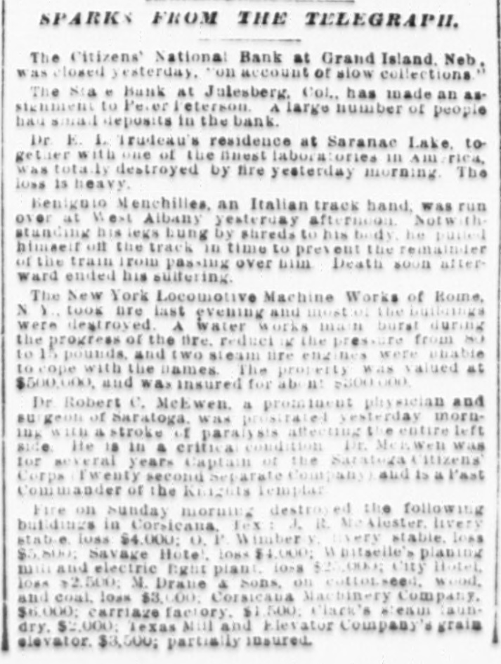 SPARKS FROM THE TELEGRAPH. The Citizens' National Bank at Grand Island. Neb. was closed yesterday. Non account of slow collections." The Sta - Bank at Julesberg, Col., has made an assigniment to Peter Peterson. A large number of people has small deposits in the bank. Dr. E. 1. Trudeau's residence at Saranae Lake, together with one of the linest laboratories in America, was totally destroyed by fire yesterday morning. The loss is heavy. Renignio Menchilles, an Italian track hand, was run over at West Albany yesterday afternoon. Notwithstanding his legs Lung by shreds to his body, be puried himself on the track ID time to prevent the remainder of the train 1rom passing over 111111 Death soon afterward ended his sulfering. The New York Locomotive Machine Works of Rome, N X., took are last evening and mostol the buildings were destroyed. A water works man burst during the progress of the Dre. reduct - the pressure from to 15 pounds. and two steam life engines were shable to cope with the names. The property was valued at $500,000, and was insured for ab n: $300.000, Dr Robert e. McEwen. a prominent physician and su geon of Saratoga. was prositated yesterday morn10g WITH . stroke of paralysis attecting the entire left side He 18 in a critical condition Dr. Memwen was for several years Captain of the Saratega & itizens Corps Twenty second Separate Company and 15 it Past Commander of the Knights Templar Fire on runday morning destroyed the following buildings in Corsicana, Tex J. R. Me Alester. livery stable loss $4,000; 0. P. Wimber every stable. loss $5,800 Savage Hotel. Loss $4,000; initselle's planing mm and electric light plant. 10-8 $25,000; City Hotel loss $2,500; M. Drane & Sons, on cottonseed. wood, and coal. loss $3,000; Corsicana Machinery Company, $6,000; carriaze factory. $1,500; Clark's seam laundry. $2,000; lexas Mill and Elevator Company's grain elevator. $3,500; partially insured.