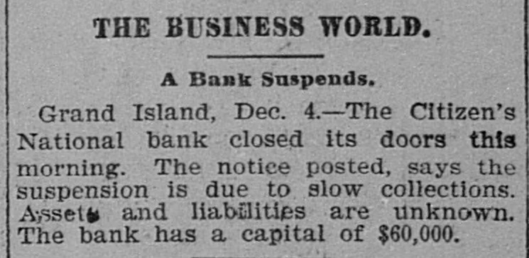 Multiple contemporaneous newspaper dispatches (Dec 4–5, 1893) report the Citizens' National Bank of Grand Island 'closed its doors' and posted a notice that the suspension was 'due to slow collections.' Comptroller Eckels appointed a receiver (Edgar M. Westervelt) in mid-December 1893, indicating the suspension led to formal receivership and permanent closure. No bank run is described in the articles.