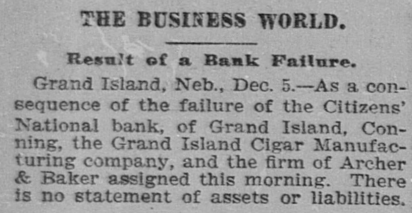 THE BUSINESS WORLD. Result of a Bank Failure. Grand Island, Neb., Dec. 5.-As a consequence of the failure of the Citizens' National bank, of Grand Island, Conning, the Grand Island Cigar Manufacturing company, and the firm of Archer & Baker assigned this morning. There is no statement of assets or liabilities.