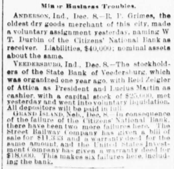 Min 18" Business Troubles. ANDERSON, Ind., Dec. 8.-R. P. Grimes, the oldest dry goods merchant of this city, made A voluntary assignment yesterday. naming W T. Durbin of the Citizens' National Bank as receiver. Liabilities, $40,000: nominal assets about the same. VEEDERSBURG, Ind., Dec. 8.-The stockholders of the State Bank of Veedersburg. which was organized one year ago. with Reid Zeigler of Attica as President and Lucius Martin as cashier. with & capital stock of $25,000, met yesterday and went into voluntary liquidation. All depositors will be paid in full GRAND ISLAND, Neb., Dec. X. In consequence of the failure of the Citizens' National Bank. there have been two more failures here, The Street Railway Company has given a bill of sale for $11,333 and a warranty deed for the same amount, and the United States Investment Company has given a warranty deed for $18,000. This makes six failures here, including the bank.