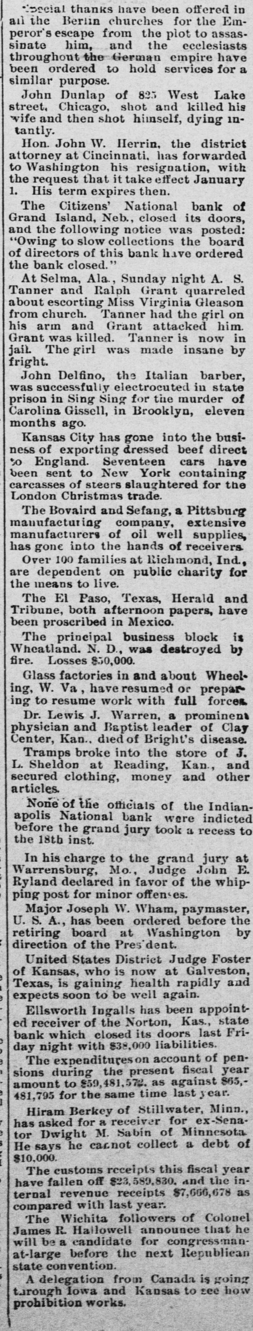 :social thanks have been offered in all the Berlin churches for the Emperor's escape from the plot to assassinate him, and the ecclesiasts throughout the German empire have been ordered to hold services for a similar purpose. John Dunlap of 823 West Lake street, Chicago, shot and killed his wife and then shot himself, dying intantly. Hon. John W. Herrin. the district at Cincinnati. attorney has forwarded with to Washington his resignation, the request that it take effect January 1. His term expires then. The Citizens' National bank of Grand Island, Neb., closed its doors, and the following notice was posted: "Owing to slow collections the board of directors of this bank have ordered the bank closed." At Selma, Ala., Sunday night A. S. Tanner and Ralph Grant quarreled about escorting Miss Virginia Gleason from church. Tanner had the girl on his arm and Grant attacked him. Grant was killed. Tanner is now in jail. The girl was made insane by fright. John Delfino, the Italian barber, was successfully electrocuted in state prison in Sing Sing for the murder of Carolina Gissell, in Brooklyn, eleven months ago. Kansas City has gone into the business of exporting dressed beef direct to England. Seventeen cars have been sent to New York containing carcasses of steers slaughtered for the London Christmas trade. The Bovaird and Sefang, a Pittsburg manufacturing company, extensive manufacturers of oil well supplies, has gone into the hands of receivers Over 100 families at Richmond, Ind., are dependent on public charity for the means to live. The El Paso, Texas, Herald and Tribune, both afternoon papers, have been proscribed in Mexico. The principal business block is Wheatland. N. D., was destroyed by fire. Losses $50,000. Glass factories in and about WheelW. have or ing, Va, resumed with full prepar- forces ing to resume work Dr. Lewis J. Warren, a prominent physician and Baptist leader of Clay Center, Kan., died of Bright's disease. Tramps broke into the store of J. L. Sheldon at Reading, Kan, and secured clothing, money and other articles. None of the officials of the Indianapolis National bank were indicted before the grand jury took a recess to the 18th inst. In his charge to the grand jury at Mo., Judge John E. declared in favor Warrensburg, Ryland of the whipping post for minor offenses. Major Joseph W. Wham, paymaster, U. S. A., has been ordered before the retiring board at Washington by direction of the Pres dent. United States District Judge Foster who is now at Galveston, is health and of Texas, Kansas, gaining rapidly expects soon to be well again. Ellsworth Ingalls has been appointed receiver of the Norton, Kas., state closed its Fribank which liabilities. doors last day night with $38,000 pene i The during expenditureson account fiscal of sions the present year amount to $59,481,572. as against $65,i 481,795 for the same time last year Hiram Berkey of Stillwater, Minn., has asked for a receiver for ex-Senator Dwight M. Sabin of Minnesota He says he carnot collect a debt of $10,000. The customs receipts this fiscal year fallen off $23,589,830. and the inrevenue receipts as ternal have $7,666,678 compared with last year. The Wichita followers of Colonel James R. Hailowell announce that he will be a candidate for congressmanat-large before the next Republican state convention. A delegation from Canada is going through Iowa and Kansas to see how prohibition works.