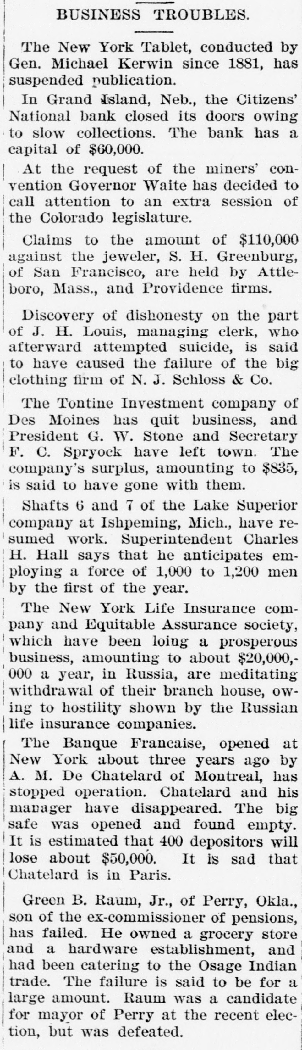 BUSINESS TROUBLES. The New York Tablet, conducted by Gen. Michael Kerwin since 1881, has suspended publication. In Grand Island, Neb., the Citizens' National bank closed its doors owing to slow collections. The bank has a capital of $60,000. At the request of the miners' convention Governor Waite has decided to call attention to an extra session of the Colorado legislature. Claims to the amount of $110,000 against the jeweler, S. H. Greenburg, of San Francisco, are held by Attleboro, Mass., and Providence firms. Discovery of dishonesty on the part of J. H. Louis, managing clerk, who afterward attempted suicide, is said to have caused the failure of the big clothing firm of N. J. Schloss & Co. The Tontine Investment company of Des Moines has quit business, and President G. W. Stone and Secretary F. C. Spryock have left town. The company's surplus, amounting to $835, is said to have gone with them. Shafts 6 and 7 of the Lake Superior company at Ishpeming, Mich., have resumed work. Superintendent Charles H. Hall says that he anticipates employing a force of 1,000 to 1,200 men by the first of the year. The New York Life Insurance company and Equitable Assurance society, which have been loing a prosperous business, amounting to about $20,000,000 a year, in Russia, are meditating withdrawal of their branch house, owing to hostility shown by the Russian life insurance companies. The Banque Francaise, opened at New York about three years ago by A. M. De Chatelard of Montreal, has stopped operation. Chatelard and his manager have disappeared. The big safe was opened and found empty. It is estimated that 400 depositors will lose about $50,000. It is sad that Chatelard is in Paris. Green B. Raum, Jr., of Perry, Okla., son of the ex-commissioner of pensions, has failed. He owned a grocery store and a hardware establishment, and had been catering to the Osage Indian trade. The failure is said to be for a large amount. Raum was a candidate for mayor of Perry at the recent election, but was defeated.