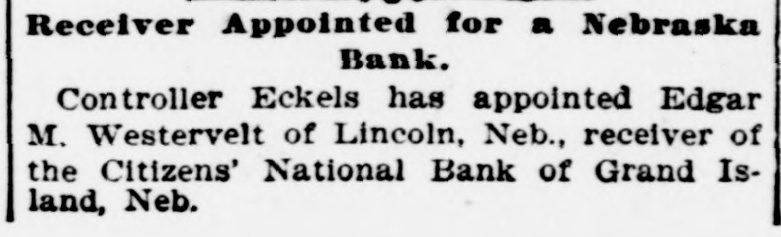 Receiver Appointed for a Nebraska Bank. Controller Eckels has appointed Edgar M. Westervelt of Lincoln, Neb., receiver of the Citizens' National Bank of Grand Island, Neb.
