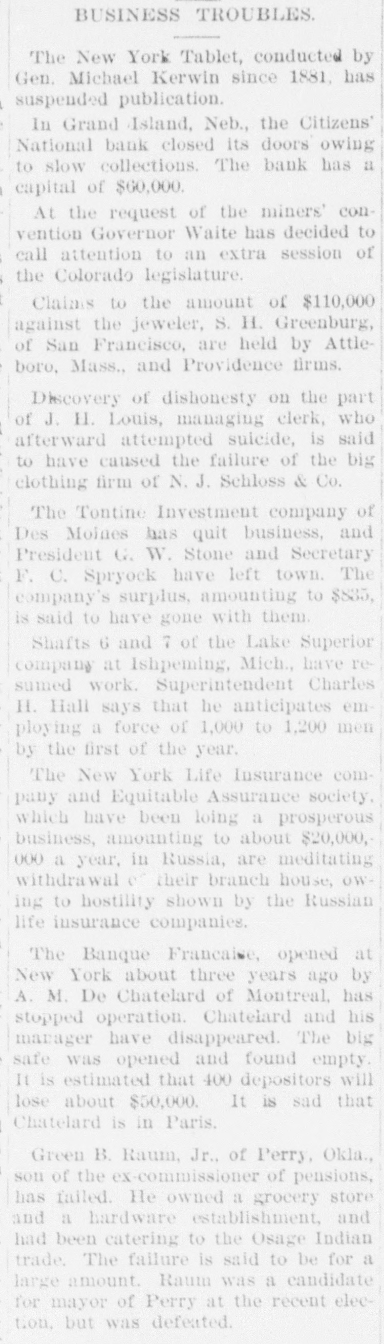 BUSINESS TROUBLES. The New York Tablet, conducted by Gen. Michael Kerwin since 1881, has suspended publication. In Grand Island, Neb., the Citizens' National bank closed its doors owing to slow collections. The bank has a capital of $60,000. At the request of the miners' convention Governor Waite has decided to call attention to an extra session of the Colorado legislature. Claims to the amount of $110,000 against the jeweler, S. H. Greenburg, of San Francisco, are held by Attleboro, Mass., and Providence firms. Discovery of dishonesty on the part of J. H. Louis, managing clerk, who afterward attempted suicide, is said to have caused the failure of the big clothing firm of N. J. Schloss & Co. The Tontine Investment company of Des Moines has quit business, and President G. W. Stone and Secretary F. C. Spryock have left town. The company's surplus, amounting to $835, is said to have gone with them. Shafts 6 and 7 of the Lake Superior company at Ishpeming, Mich., have resumed work. Superintendent Charles H. Hall says that he anticipates employing a force of 1,000 to 1,200 men by the first of the year. The New York Life Insurance company and Equitable Assurance society. which have been loing a prosperous business, amounting to about $20,000,000 a year, in Russia, are meditating withdrawal or their branch house, owing to hostility shown by the Russian life insurance companies. The Banque Francaise, opened at New York about three years ago by A. M. De Chatelard of Montreal, has stopped operation. Chatelard and his manager have disappeared. The big safe was opened and found empty. It is estimated that 400 depositors will lose about $50,000. It is sad that Chatelard is in Paris. Green B. Raum, Jr., of Perry, Okla., son of the ex-commissioner of pensions, has failed. He owned a grocery store and a hardware establishment, and had been catering to the Osage Indian trade. The failure is said to be for a large amount. Raum was a candidate for mayor of Perry at the recent election, but was defeated.