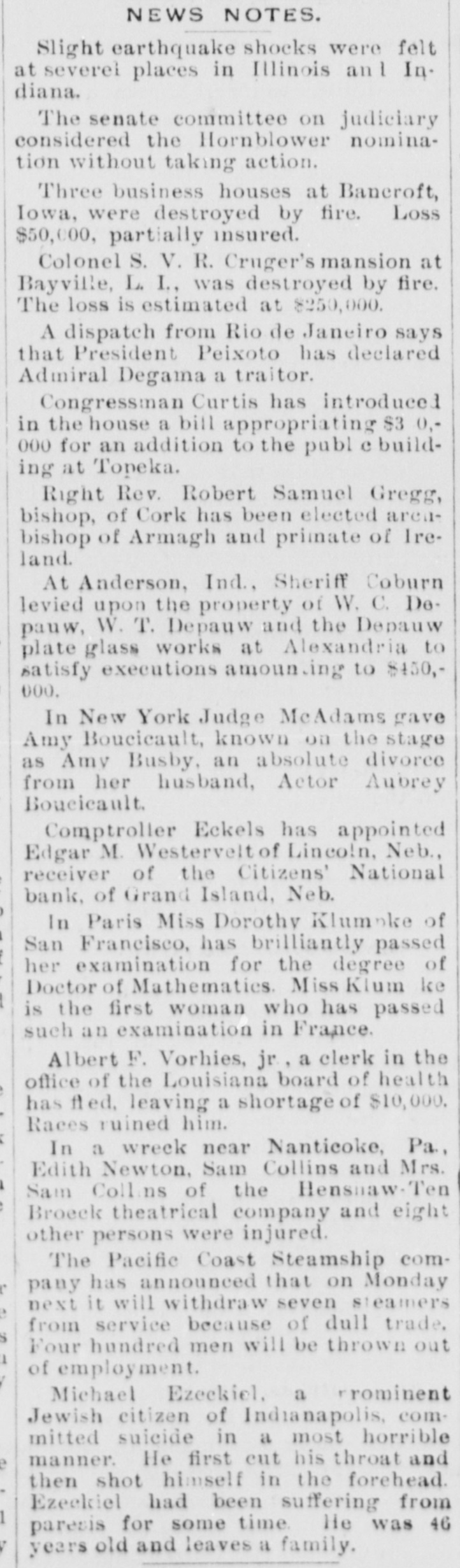 NEWS NOTES. Slight earthquake shocks were felt at severel places in Illinois and In. diana. The senate committee on judiciary considered the Hornblower nomination without taking action. Three business houses at Baneroft, Iowa, were destroyed by fire. Loss $50,000, partially insured. Colonel S. V. R. Cruger's mansion at Bayville, L. I., was destroyed by fire. The loss is estimated at $250,000. A dispatch from Rio de Janeiro says that President Peixoto has declared Admiral Degama a traitor. Congressman Curtis has introduced in the house a bill appropriating $3 0,000 for an addition to the publ e building at Topeka. Right Rev. Robert Samuel Gregg, bishop, of Cork has been elected areabishop of Armagh and primate of Ireland. At Anderson, Ind., Sheriff Coburn levied upon the property of W. C. Depauw, W. T. Depauw and the Depauw plate glass works at Alexandria to satisfy executions amounting to $450,000. In New York Judge McAdams gave Amy Boucicault, known on the stage as Amy Busby, an absolute divorce from her husband, Actor Aubrey Boucicault. Comptroller Eckels has appointed Edgar M. Westervelt of Lincoln, Neb., receiver of the Citizens' National bank, of Grand Island, Neb. In Paris Miss Dorothy Klumnke of San Francisco, has brilliantly passed her examination for the degree of Doctor of Mathematics. Miss Klum ke is the first woman who has passed such an examination in France. Albert F. Vorhies, jr, a clerk in the office of the Louisiana board of health has fled, leaving a shortage of $10,000. Races ruined him. In a wreck near Nanticoke, Pa., Edith Newton, Sam Collins and Mrs. Sam Collins of the Hensnaw- Ten Broeck theatrical company and eight other persons were injured. The Pacific Coast Steamship company has announced that on Monday next it will withdraw seven steamers from service because of dull trade. Four hundred men will be thrown out of employment. Michael Ezeckiel. a rrominent Jewish citizen of Indianapolis, committed suicide in a most horrible manner. He first cut his throat and then shot himself in the forehead. Ezeckiel had been suffering from paresis for some time. He was 46 years old and leaves a family.