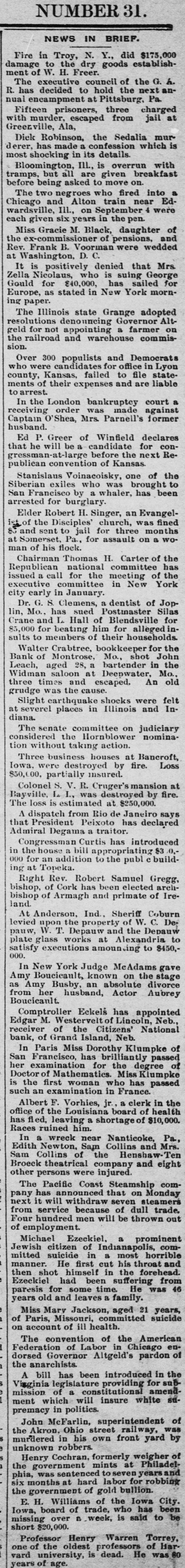 NUMBER 31. NEWS IN BRIEF. Fire in Troy, N. Y., did $175,000 damage to the dry goods establishment of W. H. Freer The executive council of the G. R has decided to hold the next annual encampment at Pittsburg, Pa. Fifteen prisoners, three charged with murder, escaped from jail at Greenville, Ala, Diek Robinson, the Sedalia mur derer, has made a confession which most shocking in its details. Bloomington, III., is overrun with tramps, but all are given breakfast before being asked to move on The two negroes who fired into a Chicago and Alton train near Edwardsville, Ill., on September 4 were each given six years in the pen. Miss Gracie M. Black, daughter of the ex-commissioner of pensions, and Rev. Frank B. Voorman were wedded at Washington, D. C. It is positively denied that Mrs. Zella Nicolaus, who is suing George Gould for $40,000, has sailed for Europe, as stated in New York morning paper. The Illinois state Grange adopted resolutions denouncing Governor Altgeld for not appointing a farmer on the railroad and warehouse commission. Over 300 populists and Democrats who were candidates for office in Lyon county, Kansas, failed to file statements of their expenses and are liable to arrest In the London bankruptcy court a receiving order was made against Captain O'Shea, Mrs. Parnell's former husband. Ed P. Greer of Winfield declares that he will be a candidate for conrressman-at-large before the next Republican convention of Kansas Stanislaus Voinacoisky, one of the Siberian exiles who was brought to San Francisco by whaler, has been arrested for burglary. Elder Robert H. Singer, an Evangel1st of the Disciples church, was fined 85 and sent to jail for three months at Somerset, Pa., for assault on a wo man of his flock. Chairman Thomas H. Carter of the Republican national committee has issued a call for the meeting of the executive committee in New York city early in January. Dr. G. S. Clemens, a dentist of JopMo., has sued Postmaster Silas Crane lin, and L. Hall of Blendsville for 85,000 for beating him for alleged in sults to members of their households. Walter Crabtree, bookkeepe for the Bank of Montrose, Mo., shot John Leach, aged 28, a bartender in the Widman saloon at Deepwater, Mo. old three times and escaped. An grudge was the cause. Slight earthquake shocks were felt at severel places in Illinois and Indiana. The senate committee on judiciary considered the Hornblower nomination without taking action. Three business houses at Bancroft, Iowa, were destroyed by fire. Loss $50,000. partially insured. Colonel S. V. R. Cruger's mansion : at Bayville, L was destroyed by fire. The loss is estimated at $250,000. A dispatch from Rio de Janeiro says that President Peixoto has declared Admiral Degama traitor. Congressman Curtis has introduced in the house a bill appropriating $3.0. 000 for an addition to the publi building at Topeka. Right Rev. Robert Samuel Gregg, bishop, of Cork has been elected archbishop of Armagh and primate of Ireland. At Anderson, Ind., Sheriff Coburn levied upon the property of W. C. De: pauw, W. T. Depauw and the Depauw plate glass works at Alexandria to satisfy executions amounting to $450,000. In New York Judge MeAdams gave Amy Boucicault, known on the stage as Amy Busby, an absolute divorce from her husband, Actor Aubrey Boucicanlt Comptroller Eckels has appointed Edgar M. Westervelt of Lincoln, Neb. receiver of the Citizens' National bank, of Grand Island, Neb. In Paris Miss Dorothy Klumpke of San Francisco, has brilliantly passed her examination for the degree of Doctor of Mathematics. Miss Klumpke is the first woman who has passed such an examination in France. Albert F. Vorhies, jr. clerk in the office of the Louisiana board of health has fled, leaving a shortage of $10,000. Races ruined him. In a wreck near Nanticoke, Pa., Edith Newton, Sam Collins and Mrs. Sam Collins of the Henshaw-Ten Broeck theatrical company and eight other persons were injured. The Pacific Coast Steamship company has announced that on Monday next it will withdraw seven steamers from service because of dull trade. Four hundred men will be thrown out of employment. Michael Ezeckiel. a prominent Jewish citizen of Indianapolis, committed suicide in most horrible He first cut his throat and manner. then shot himself in the forehead. Ezeckiel had been suffering from paresis for some time. He was 46 years old and leaves family. Miss Marv Jackson, aged 21 years, of Paris, Missouri, committed suicide on account of ill health The convention of the American of Labor in Chicago endorsed Governor Federation Altgeld's pardon of the anarchists A bill has been introduced in the Virginia legislature providing for sub- amendmission of a constitutional sument which will insure white premacy in politics. John McFarlin, superintendent was of Akron, Ohio street railway, the murdered in his own front yard by unknown robbers Henry government Cochran, mints formerly at weigher Philadel of the sentenced seven years and months phia, was at hard labor for robbink six the government of gold bullion. E. H. Williams of the Iowa City. board of trade, who has been be missing Iowa, over a week, is said to short $20,000. Professor Henry Warren Torrey, of the oldest professors of Harvard one university, is dead. He was 80 years of age.