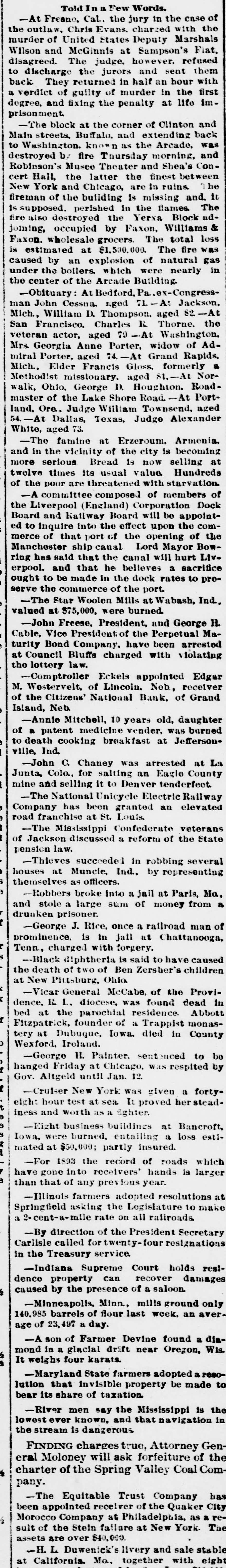 Told In a Few Words. -At Fresno, Cal. the jury in the case of the outlaw, Chris Evans. charged with the murder of United States Deputy Marshals Wilson and McGinnis at Sampson's Flat. disagreed. The judge. however. refused to discharge the jurors and sent them back They returned in half an hour with a verdict of guilty of murder in the first prisonment degree. and fixing the penalty at life 1m-The block at the corner of Clinton and Main streets. Buffalo, and extending back to Washington. known as the Arcade, was destroyed by fire Thursday morning, and Robinson's Musee Theater and Shea's Concert Hall, the latter the finest between New York and Chicago, are in ruins. The fireman of the building is missing and. It is supposed. perished in the flames. The fire also destroyed the Yerxa Block adjoining, occupied by Faxon, Williams & Faxon. wholesale grocers. The total loss is estimated at $1,500,000. The fire was caused by an explosion of natural gas under the boilers, which were nearly in the center of the Arcade Building. -Obituary: At Bedford, Pa .ex-Congressman John Cessna. aged TL-At Jackson, Mich., William D. Thompson. aged 82. -At San Francisco. Charles R. Thorne. the veteran actor, aged 79 -At Washington, Mrs. Georgia Anne Porter, widow of Admiral Porter, aged it-At Grand Rapids. Mich., Elder Francis Gloss, formerly Methodist missionary. aged $1,-At Nor- a walk, Ohio, George D. Houghton, Roadmaster of the Lake Shore Road. At Portland, Ora. Judge William Townsend. aged 54.-At Dallas, Texas, Judge Alexander White, aged 73. -The famine at Erzeroum. Armenia. and in the vicinity of the city is becoming more serious Bread is now selling at twelve times its usual value Hundreds of the poor are threatened with starvation. -A committee composed of members of the Liverpool (England) Corporation Dock Board and Kailway Board will be appointed to inquire into the effect upon the commerce of that port of the opening of the Manchester ship canal Lord Mayor Bowring has said that the canal will hurt Liverpool. and that he believes a sacrifice ought to be made in the dock rates to preserve the commerce of the port. -The Star Woolen Mills at Wabash, Ind. valued at $75,000, were burned. -John Freese, President, and George H. Cable, Vice President of the Perpetual Maturity Bond Company. have been arrested at Council Bluffs charged with violating the lottery law. -Comptroller Eckels appointed Edgar M. Westervelt, of Lincoln. Nob, receiver of the Citizens' National Bank, of Grand Island, Neb. -Annie Mitchell, 10 years old, daughter of a patent medicine vender, was burned to death cooking breakfast at Jeffersonville, Ind. -John C. Chaney was arrested at La Junta, Colo., for salting an Eagle County mine and selling it to Denver tenderfeet. -The National Unicycle Electric Railway Company has been granted an elevated road franchise at St. Louis. -The Mississippi Confederate veterans of Jackson discussed a reform of the State pension law. -Thieves succeeded in robbing several houses at Muncle, Ind., by representing themselves as officers. -Robbers broke into a jall at Paris, Ma, and stole a large sum of money from a drunken prisoner. -George J. Rice. once a railroad man of prominence. is in jail at Chattanooga, Tenn, charged with forgery. -Black diphtheria is said to have caused the death of two of Ben Zersher's children at New Pittsburg, Ohio, -Vicar General McCabe, of the Providence, R. I., diocese, was found dead in bed at the parochial residence. Abbott Fitzpatrick, founder of a Trappist monastery at Dubuque, Iowa, died in County Wexford. Ireland. -George H. Painter. sentenced to be hanged Friday at Chicago, was respited by Gov. Altgeld until Jan. 12. -Cruiser New York was given a fortyeight hour test at sea It proved her steadiness and worth as a Sghter. -Eight business buildings at Bancroft, Iowa, were burned, entailing a loss estimated at $50,000; partly insured. -For 1893 the record of roads which have gone into receivers' hands is larger than that of any previous year. -Illinois farmers adopted resolutions at Springfield asking the Legislature to make a 2-cent-a-mile rate on all railroads -By direction of the President Secretary Carlisle called for twenty-four resignations in the Treasury service. -Indiana Supreme Court holds restdence property can recover damages caused by the presence of a saloon -Minneapolis, Minn, mills ground only 140,985 barrels of flour last week. an average of 23,497 a day. -A son of Farmer Devine found a diamond in a glacial drift near Oregon, Wis. It weighs four karats. -Maryland State farmers adopted a resolution that invisible property be made to bear its share of taxation. -River men say the Mississippi is the lowest ever known, and that navigation in the stream is dangerous FINDING charges true, Attorney General Moloney will ask forfeiture of the charter of the Spring Valley Coal Company. -The Equitable Trust Company has been appointed receiver of the Quaker City Morocco Company at Philadelphia, as a result of the Stein failure at New York. The assets are over $40,000. -H. L Duwenick's livery and sale stable