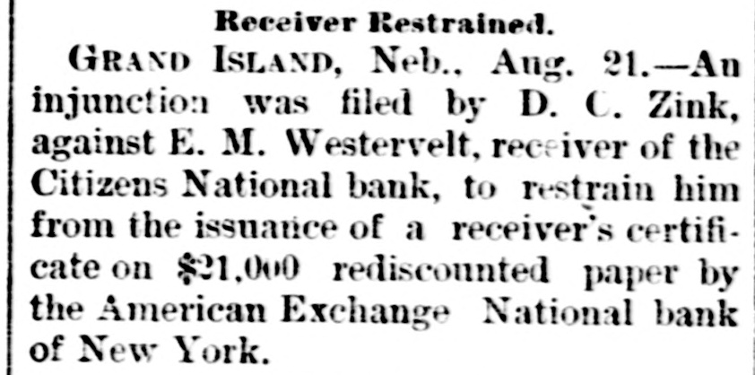 Receiver Restrained. GRAND ISLAND, Neb., Aug. 21.-An injunction was filed by D. C. Zink, against E. M. Westervelt, receiver of the Citizens National bank, to restrain him from the issuance of a receiver's certificate on $21,000 rediscounted paper by the American Exchange National bank of New York.