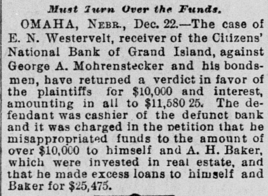Must Turn Over the Funds, OMAHA, NEBR, Dec. 22.-The case of E. N. Westervelt, receiver of the Citizens' National Bank of Grand Island, against George A. Mohrenstecker and his bondsmen, have returned a verdict in favor of the plaintiffs for $10,000 and interest, amounting in all to $11,580 25. The defendant was cashier of the defunct bank and it was charged in the petition that he misappropriated funds to the amount of over $10,000 to himself and A. H. Baker, which were invested in real estate, and that he made excess loans to himself and Baker for $25,475.